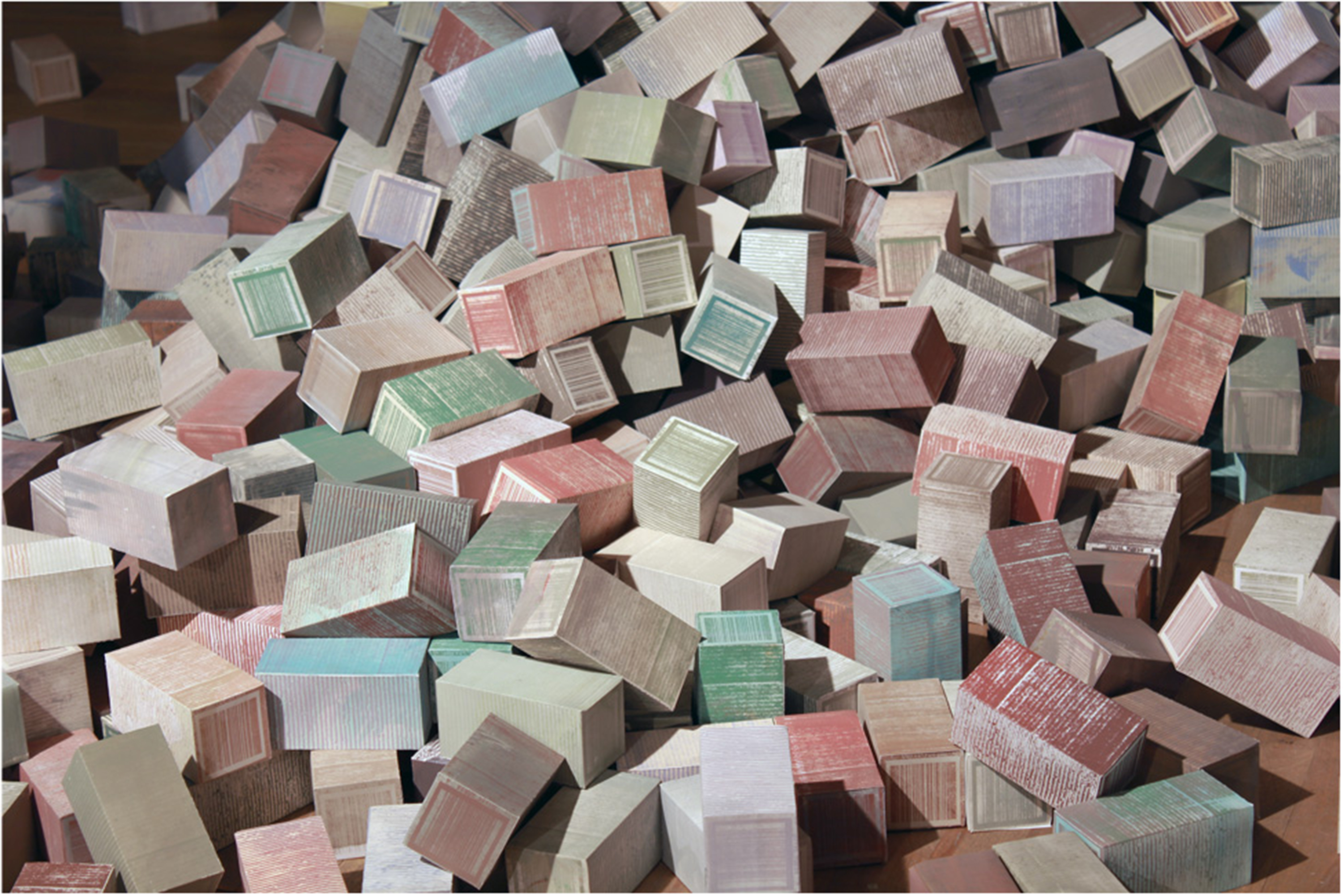 [Image caption] Mitch Mitchell, For Whom You Build (detail), 2015, silkscreen on 15,000 handmade paper boxes