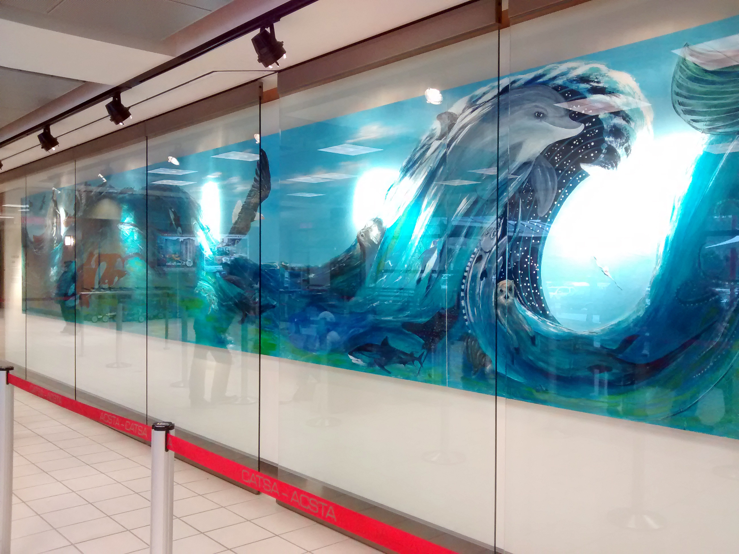 The work presents the path of a large wave that cascades from left to right across a matrix of seven five-by-five-foot-square wooden panels that are mounted together, creating a continuous 35-foot-long mural. Visitors might think of the 18th-century Japanese artist Hokusai and his famous Great Wave work in block print, but Clusiau's work has been created in a more contemporary fashion. Various creatures that rely on water as their habitat - a porpoise, otter, eagle, orca, shark, and even a mermaid - are presented cavorting in the large wave.