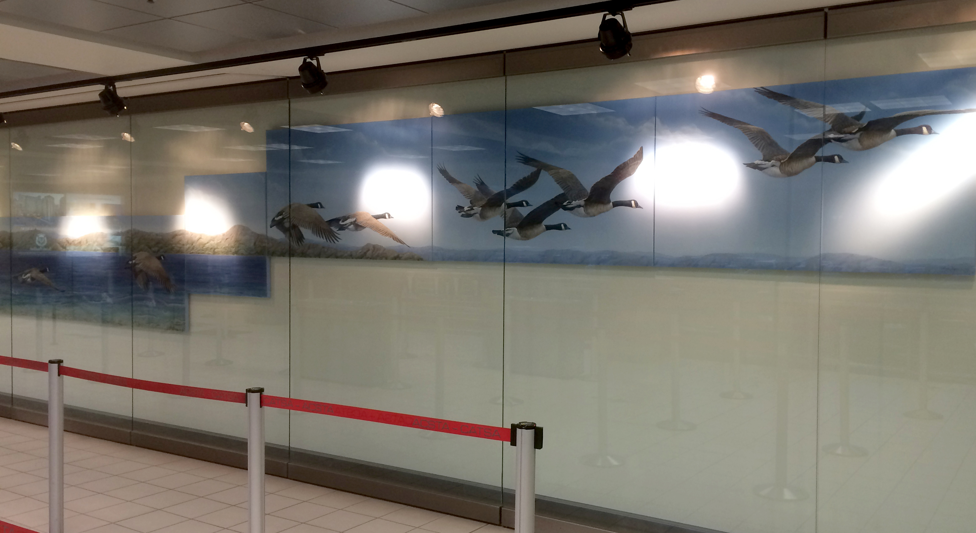 May 20, 2015 - Kelowna, BC: It's not often that wildlife and the inside of airports mix - so visitors on their way to the departure gates at Kelowna International Airport (YLW) may do a double take. A small flock of Canada Geese appear to be rising up from a body of water into the sky. They have been painted by skilled local wildlife artist Valerie Rogers.