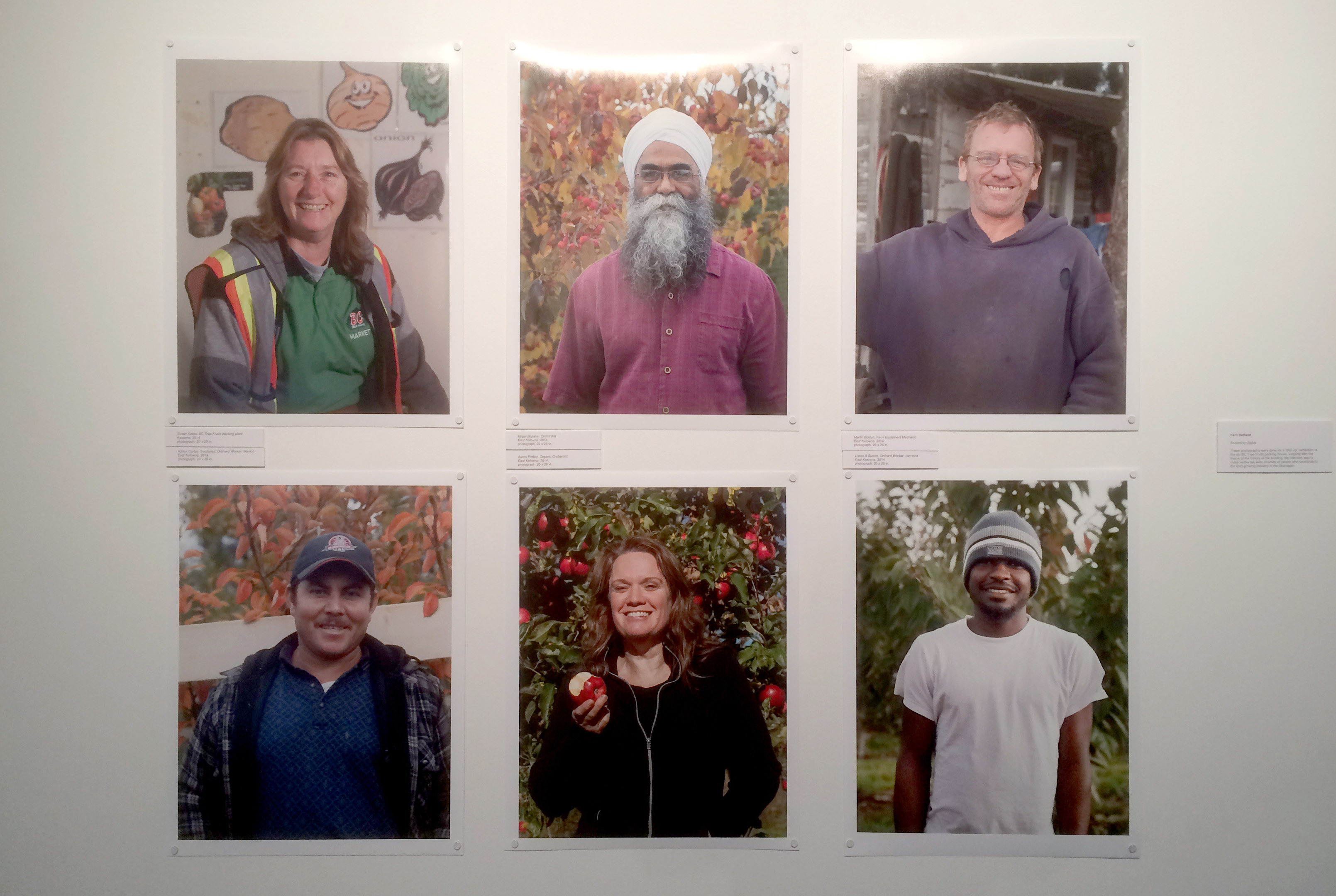 [Installation shot - Fern Helfand -resize.jpg] Installation shot of Becoming Visible by artist Fern Helfand. The photographs feature six local orchardists and orchard workers.
