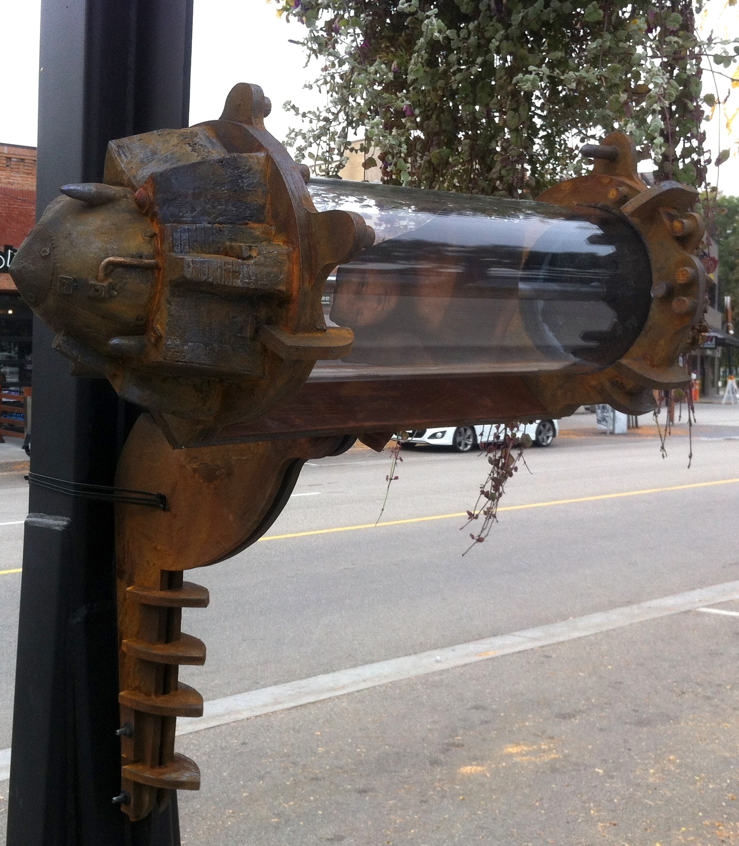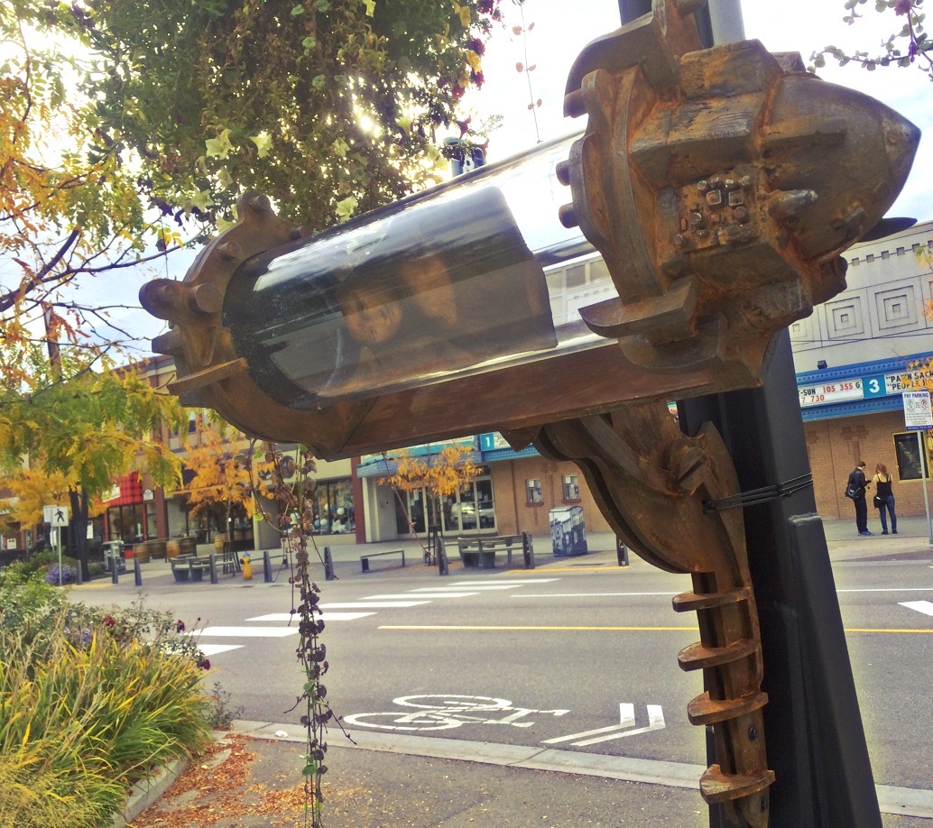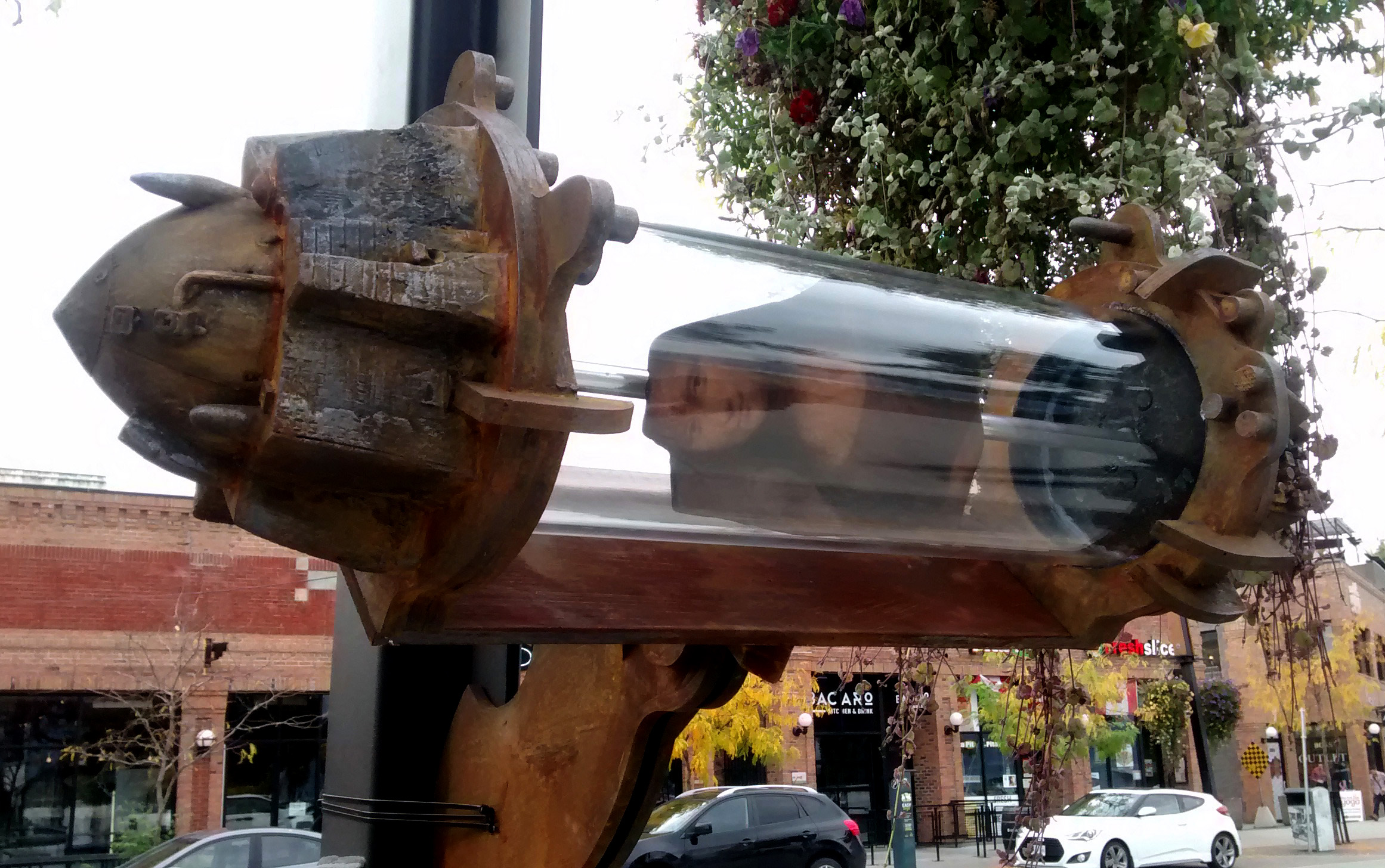 October 8, 2015 - Kelowna, BC: A third mysterious object or fossil, as they are being called, has appeared in downtown Kelowna - this time on Bernard Ave. It was first noticed by pedestrians walking along the southern edge of Kerry Park, who saw something strange attached to a light post. At first glance it looks similar to the previous fossil that appeared a few weeks ago between the Kelowna Art Gallery and the RCA - an industrial-looking capsule that contains objects sealed within. Inside this one is what appears to be a fragment of the Mona Lisa painting by Leonardo da Vinci.