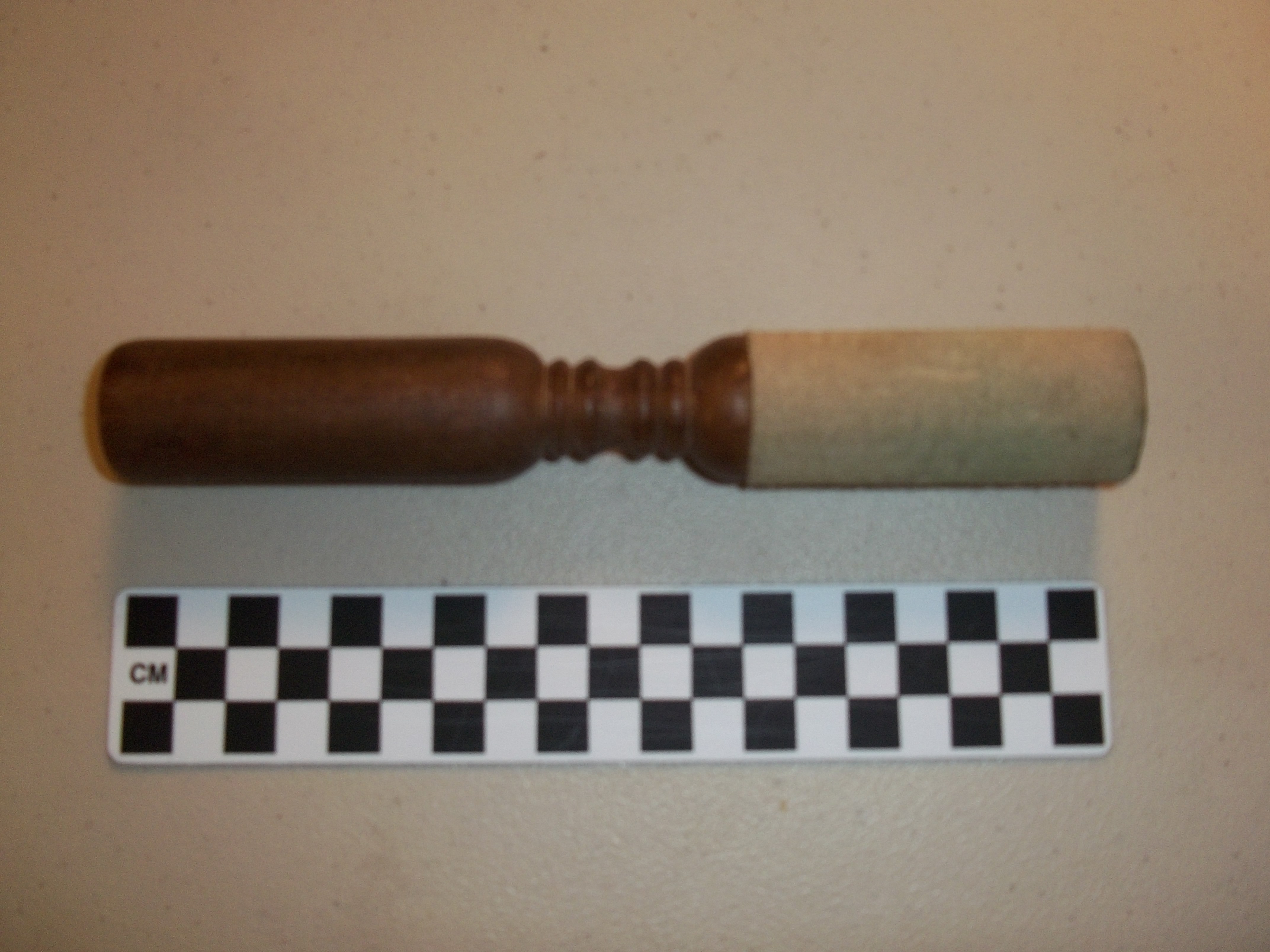 It is 7 1/2" long 1" diameter wood with suede or raw leather around half