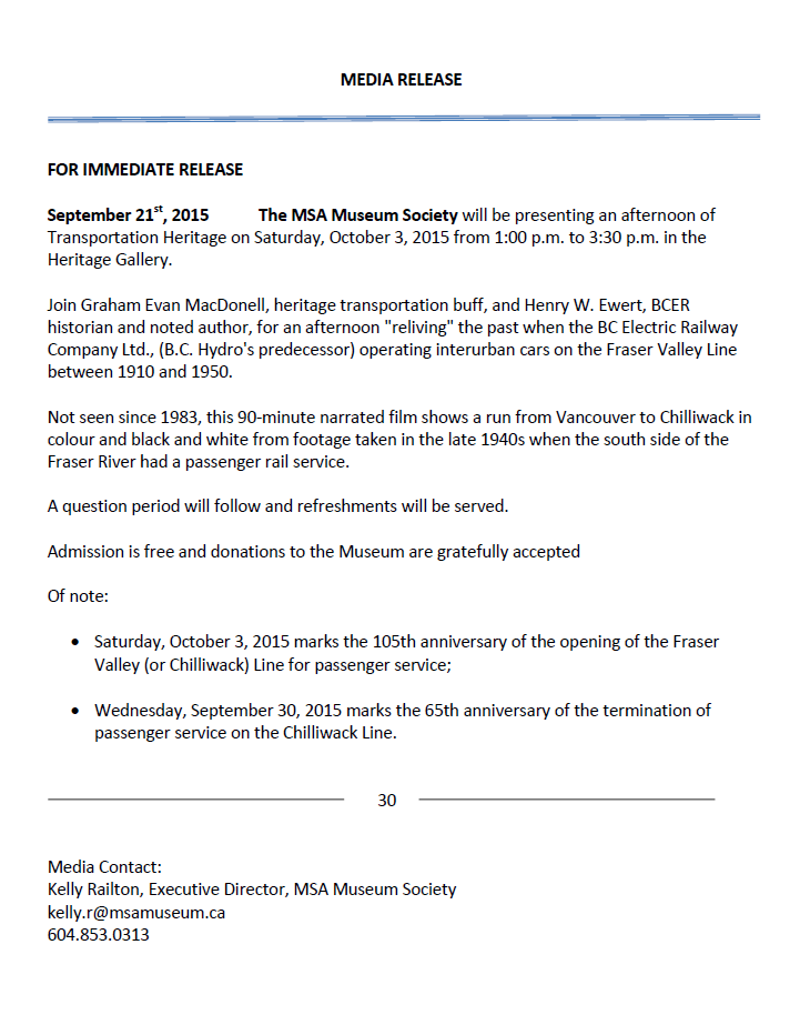 [BCMA] Media Release - The Chilliwack Line