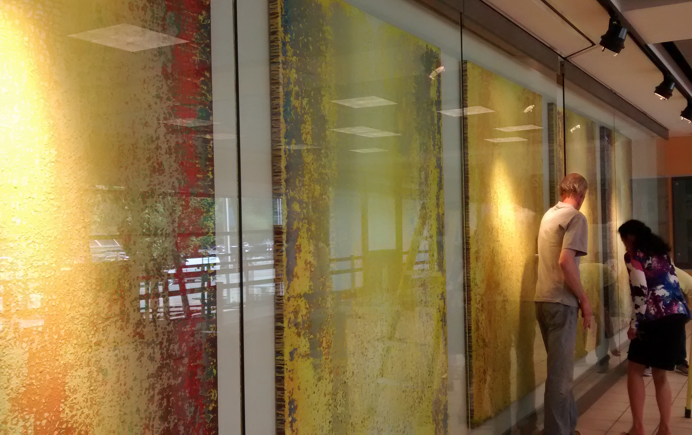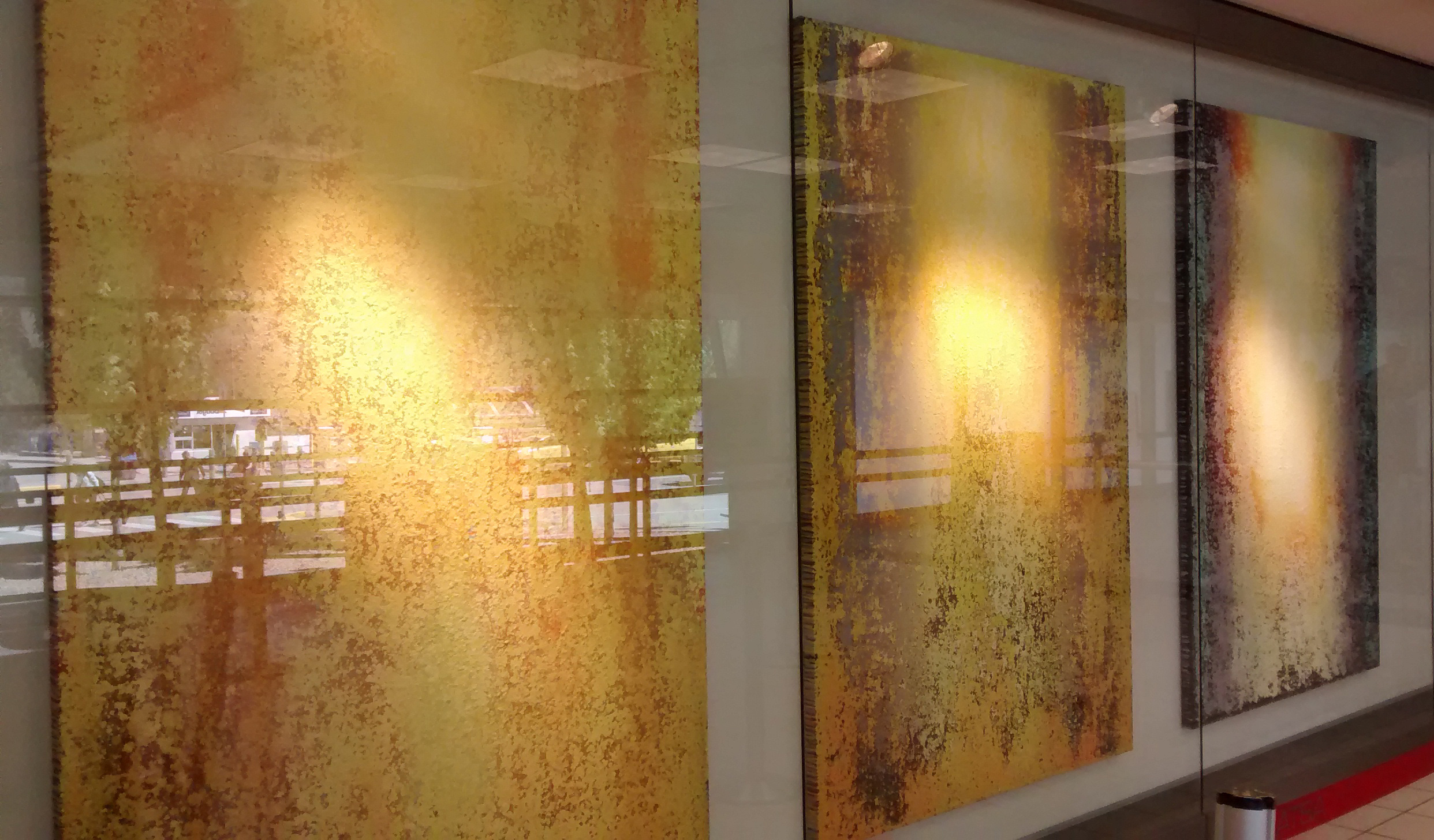 May 17, 2016 - Kelowna, BC: Sunshine has long been a topic celebrated by all kinds of artists - classic songs ranging from The Beatles' Good Day Sunshine to John Denver's Sunshine On My Shoulders, to Donovan's unforgettable groover Sunshine Superman, all pay tribute to the light from that big old glowing orb in the sky. It is all the more fitting that when Okanagan artist Heidi Thompson received a commission to create work for the Kelowna Art Gallery's space at the Kelowna International Airport she chose to explore the light of the Okanagan. She created five large-sized abstract canvasses, all containing lots of yellow - along with other colours. The texture on each is an important added element. The multi-panelled installation is entitled OK Sunshine and is currently on view at YLW until November 7, 2016. As people pass by the works on their way to the security check area of the departures wing at the airport, they may perhaps get a sense from her work of the distinctive Okanagan light.