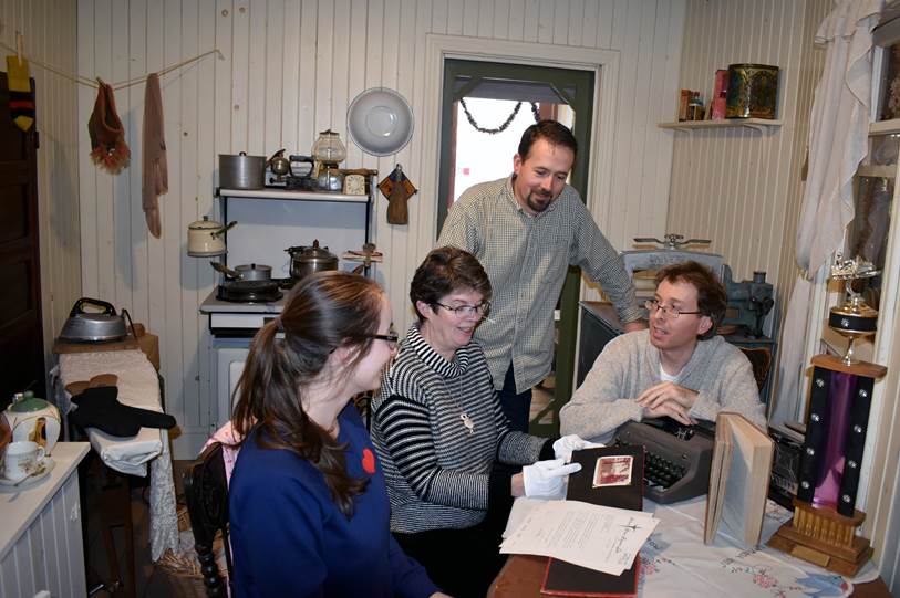 Caption: Speaker Series host Gabriel Newman (standing) discusses some of the items people may have questions about with from left, Museum Registrar Jesslyn Jarvis, Archivist Barbara Bell, and Antiques dealer Taylor Saunders.