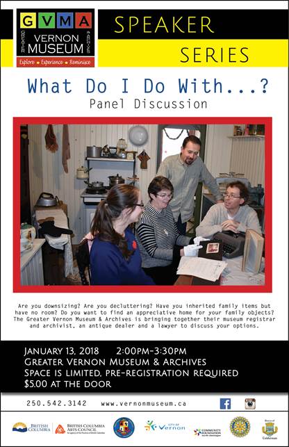 Are you downsizing? Are you decluttering? Have you inherited family items but have no room? Do you want to find an appreciative home for your family objects? The Greater Vernon Museum and Archives is bringing together their museum registrar and archivist, an antique dealer and a lawyer in a panel discussion called "What do I do with...?" on January 13th to discuss your options.