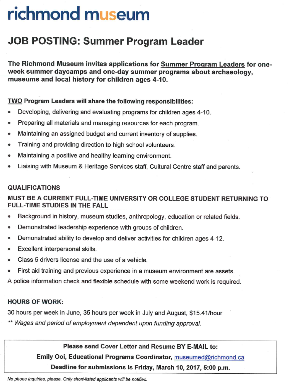 PLEASE DISTRIBUTE - Job Posting: Summer Program Leader with the Richmond Museum
