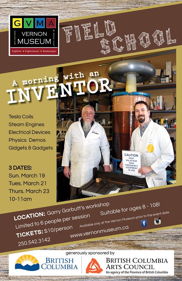 Three dates are being offered as he can only accommodate 6 people per session. "A Morning with an Inventor" takes place at Mr. Garbutt's Workshop on March 19th, 21st, and 23rd from 10:00 to 11:00am. Tickets must be purchased in advance at the Vernon Museum. Cost is $10/person. For more information call (250) 542-3142 visit www.vernonmuseum.ca<http://www.vernonmuseum.ca> or find us on facebook.