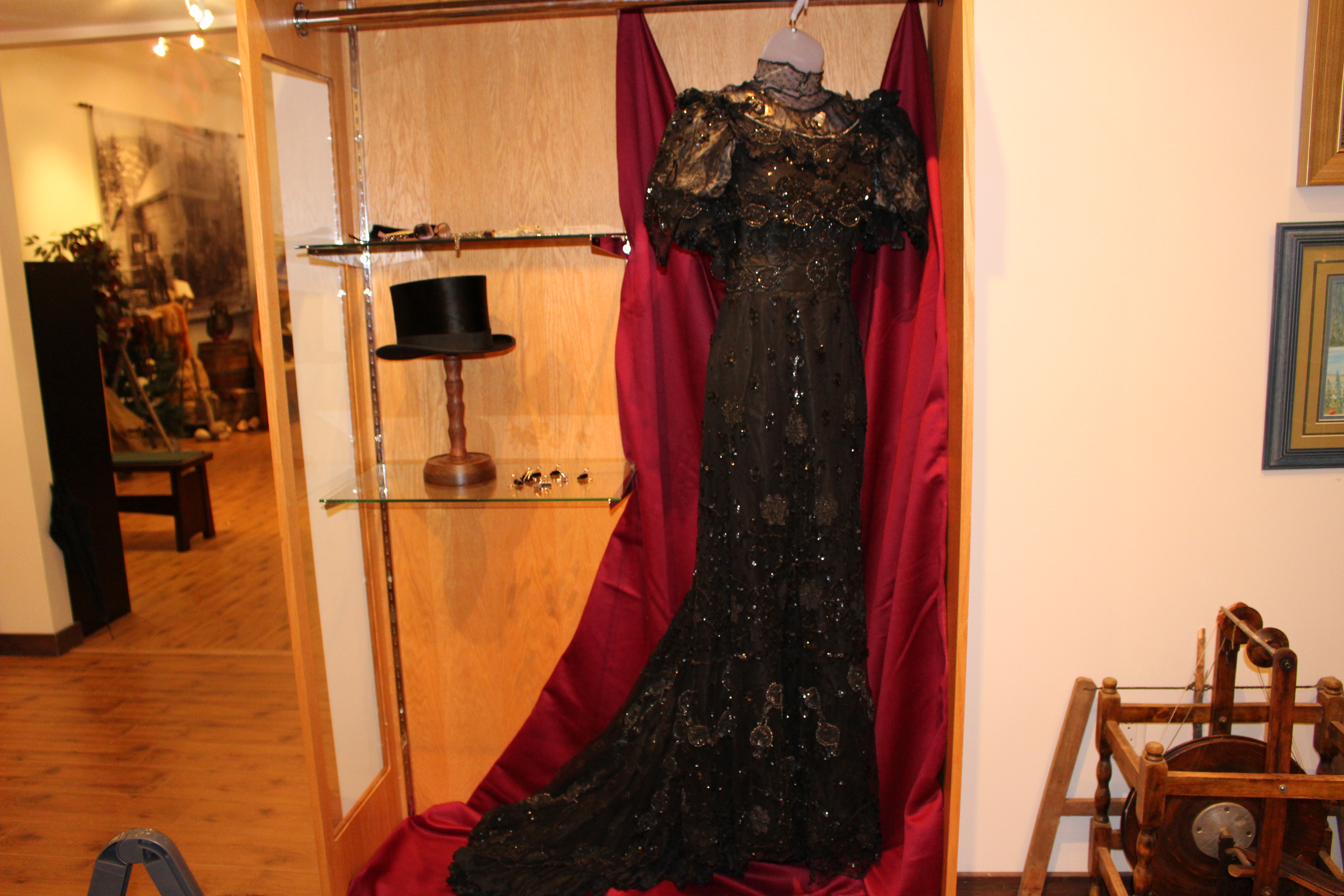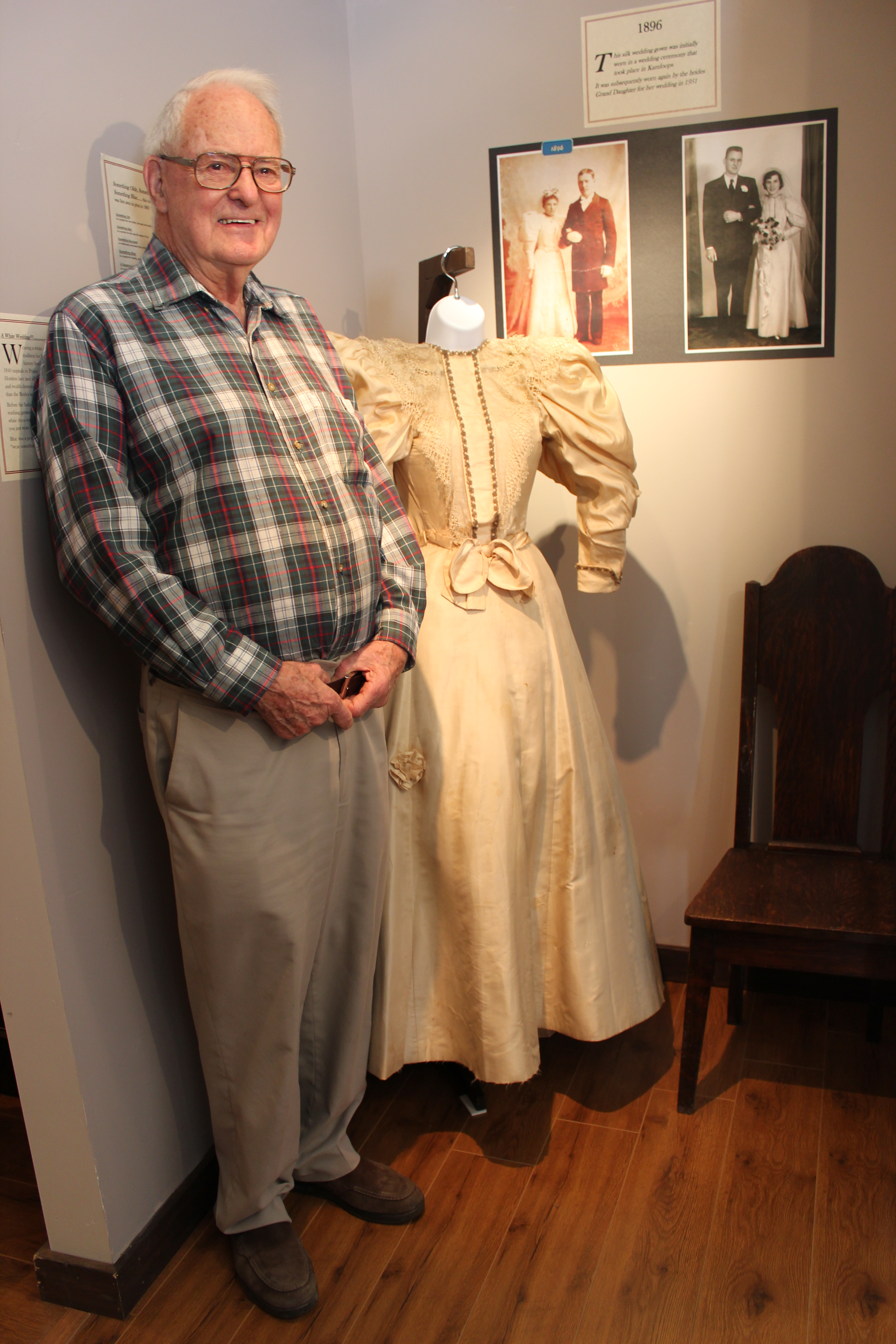 > We have been given (permanent loan) a wedding dress, veil and gloves of a