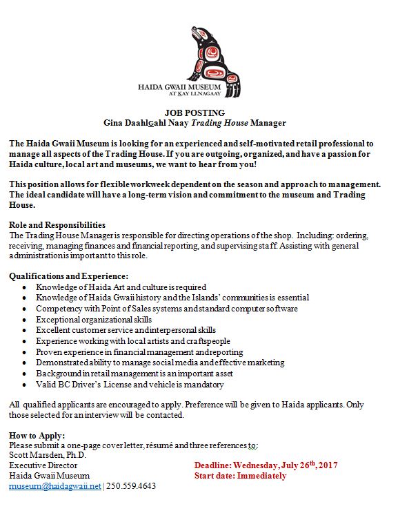 [BCMA] JOB POSTING-HAIDA GWAII MUSEUM-Gina DaahIGahI-Trading House Manager