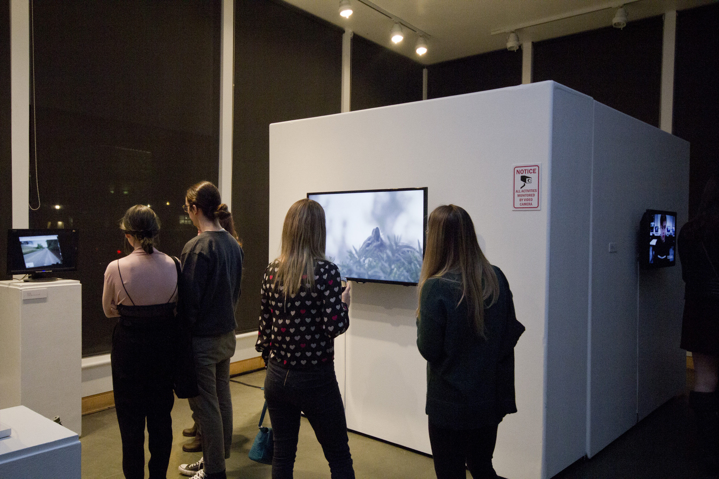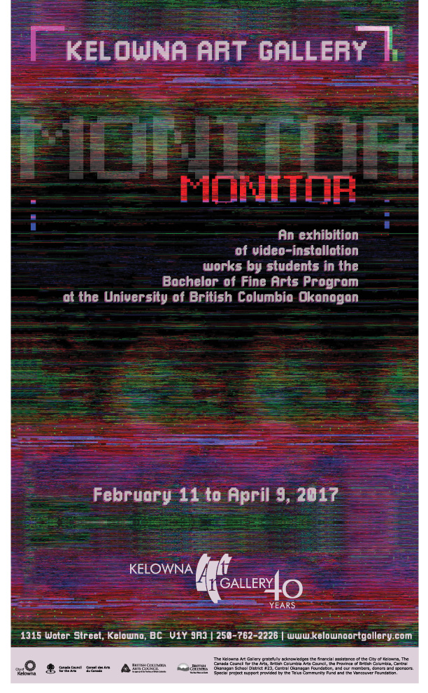 The exhibition is entitled Monitor and the artists included examine issues of surveillance, specifically when one is online. It features fourteen videos and video projections that appear on screens mounted throughout the darkened Front project space of the Kelowna Art Gallery for visitors to explore.