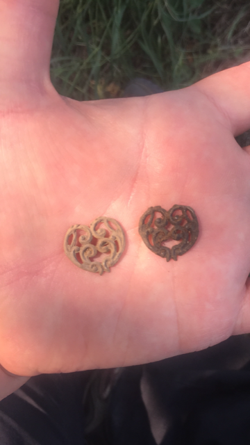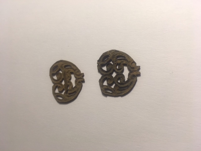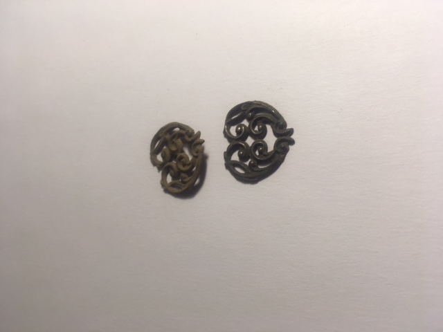 It appears to be whole, not broken off something, and has one good side. Made from a yet to be determined metal. May have been plated.