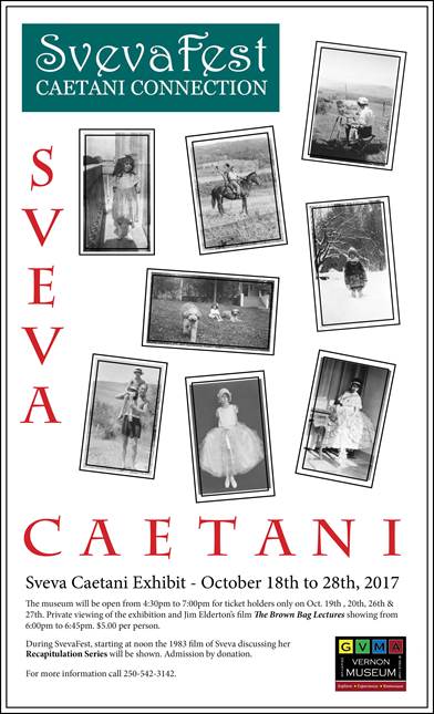 For four evenings during SvevaFest, the Greater Vernon Museum & Archives will open from 4:30pm to 7:00pm for a special ticket holder only viewing of the Sveva Caetani exhibit and showing of Jim Elderton's The Brown Bag Lectures. The film will run from 6:00pm to 6:45pm. Cost is $5.00/person.