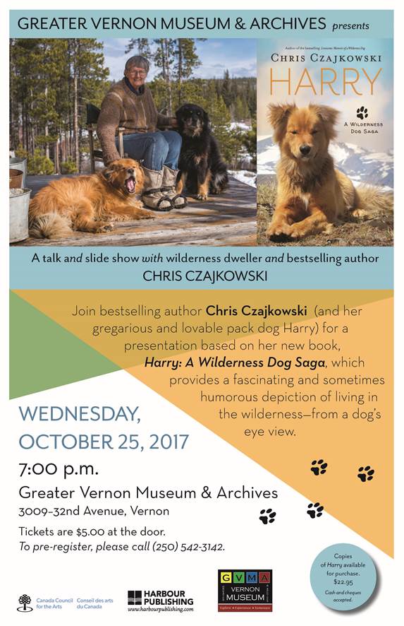 Join bestselling author Chris Czajkowski--and her gregarious and lovable pack dog Harry--for a slide show based on her new book, Harry: A Wilderness Dog Saga ($22.95, Harbour Publishing), which provides a fascinating depiction of living in the wilderness--from a dog's eye view.