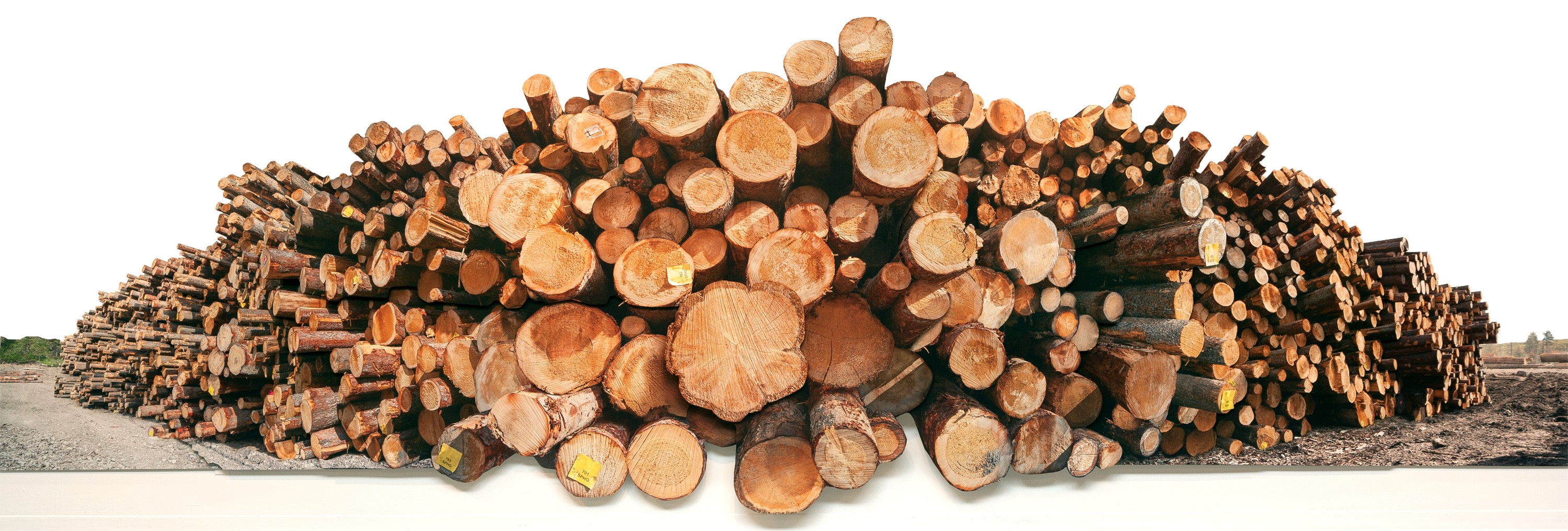 Actually, the logs are part of a massive photographic installation entitled Okanagan Log Pile by Kelowna-based artist Fern Helfand. In addition to the large scale, viewers will no doubt be struck by the three-dimensional quality that the artist has achieved by strategically mounting individual photographic panels in layers.