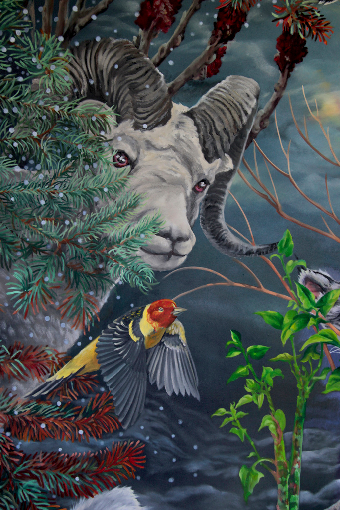 A series of large paintings by Vernon-based artist Julie Oakes have been installed in the forty-foot-long satellite exhibition space that the Kelowna Art Gallery curates. The installation is entitled Awestruck, Calendar of Ecology, and the four works that comprise it each depict a season of the year, with flora and fauna that are native to the Okanagan.