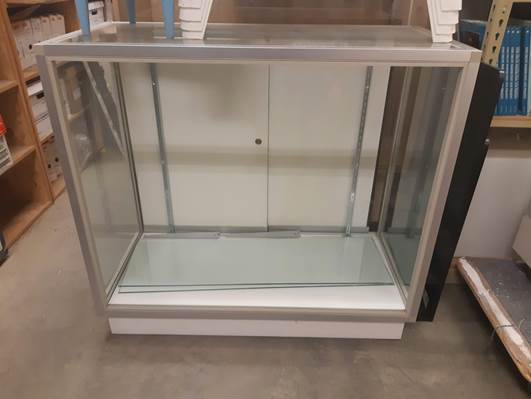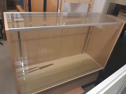 Glass and laminate display case with 2 glass shelves, adjustable shelf hardware and sliding rear doors. Very sturdy. Dimensions approx 40" x 42" x 18".