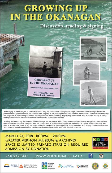 A discussion of the book, reading and signing will take place at the Greater Vernon Museum & Archives Saturday March 24th from 1:00pm - 2:00pm. The book, Growing up in the Okanagan, will be available for purchase during the event or you can pick up a copy later at the museum, Bookland, Expressions of Time, or order on Amazon at https://www.amazon.com/Growing-ip-Okanagan-Vivian-Merchant/dp/1973953676.