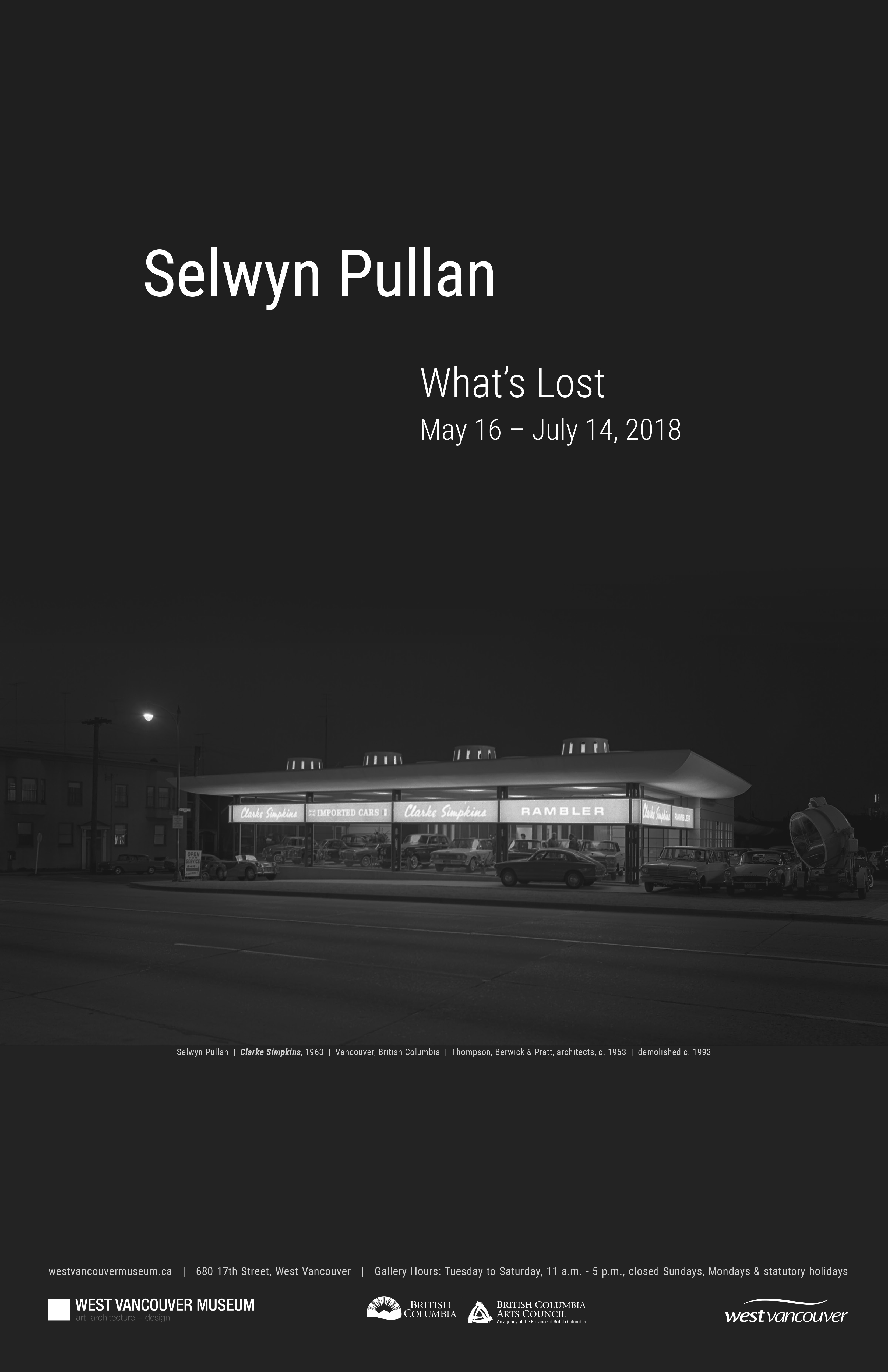 What's Lost is both a tribute to Selwyn Pullan and a reflection on a vanishing era. The exhibition includes portraits of architects and artists, as well as images of residential and commercial buildings and interiors that once formed part of the region's urban and cultural fabric, but have since succumbed to the ravages of time and pressures of redevelopment.