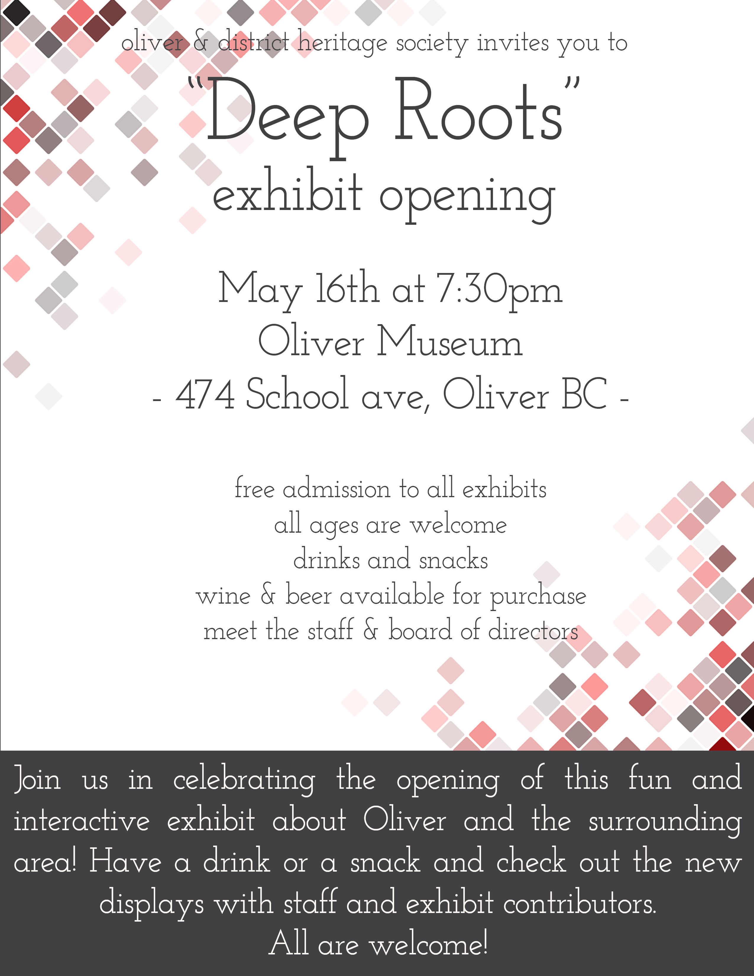 Come and celebrate with us at the opening of "Deep Roots", an interactive and modern exhibit that encompasses Oliver's natural history, culture, development, and community identity. Ribbon cutting with Member of Parliament Richard Cannings followed by entertainment, exhibit tours, & socializing. All are welcome!