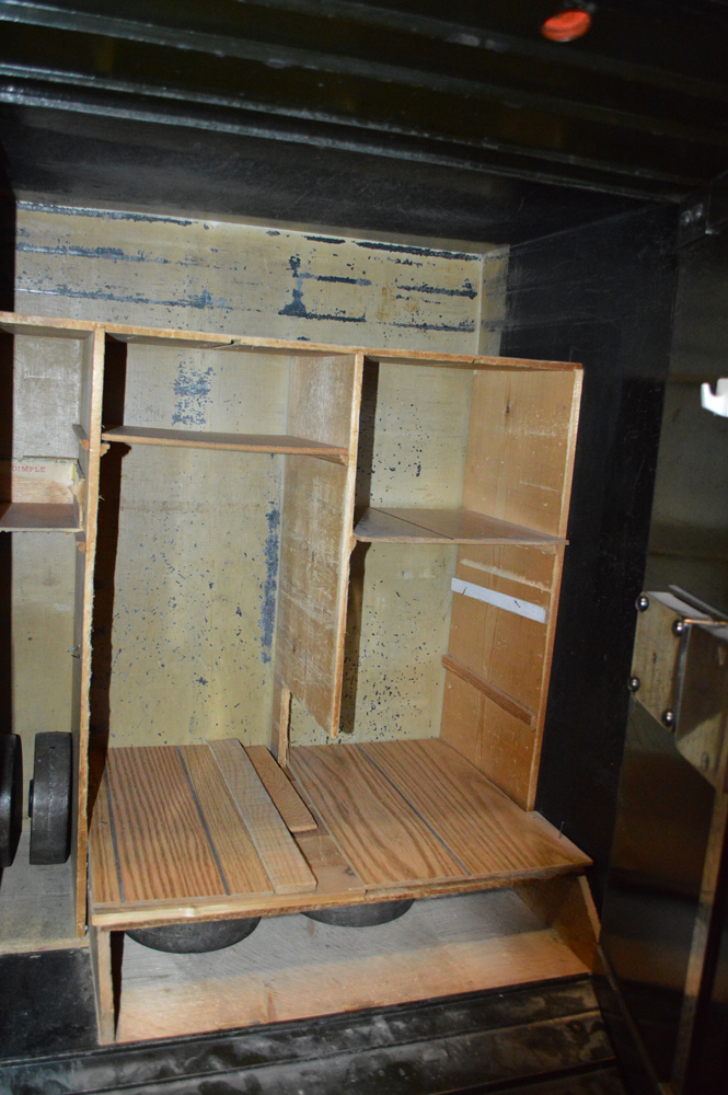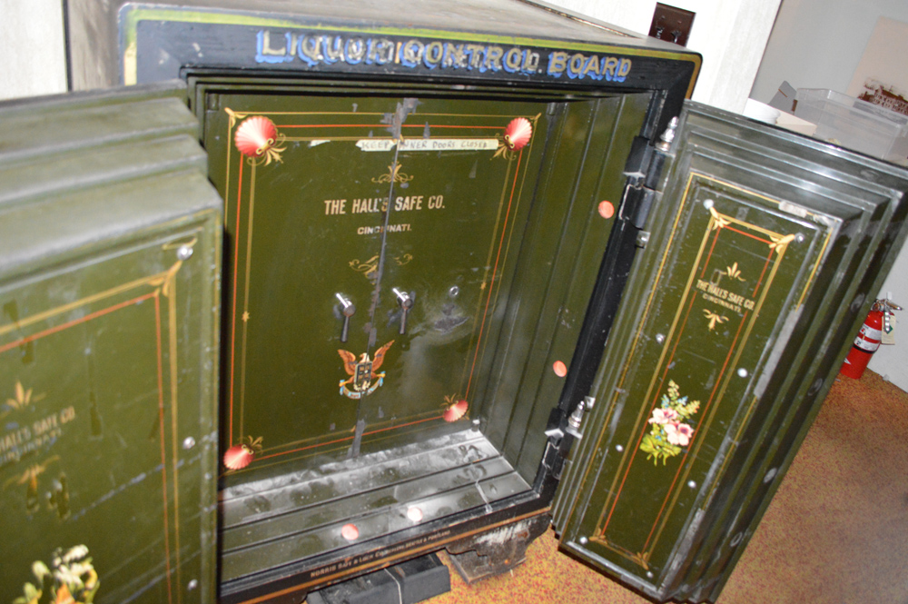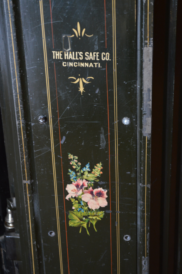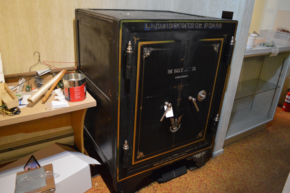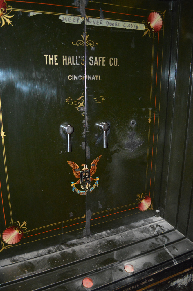 The safe was donated by the Liquor Control Board in 1984 and was used in their Nelson store. It was made by The Hall's Safe Company in Cincinnati and distributed by the Norris Safe Company of Seattle and Portland, dated circa 1905.