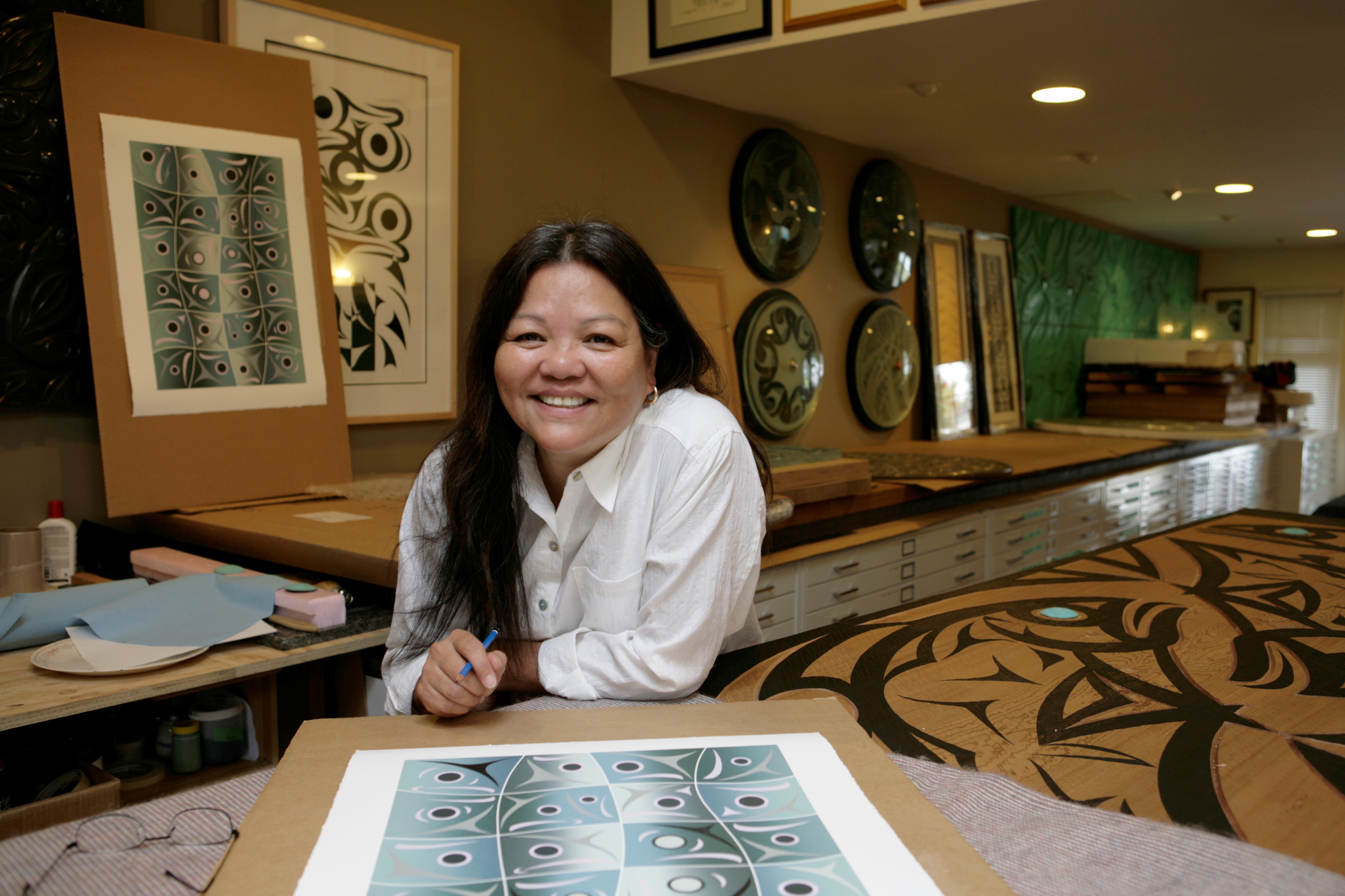 Susan Point (born 1952) is a self-taught artist who began making limited edition prints on her kitchen table in 1981 while working as a legal secretary. Fast-forward three and a half decades and Point is one of Canada's most prolific public artists. She has produced more than 85 public art works, that are currently displayed across Canada, the United States, and Europe.