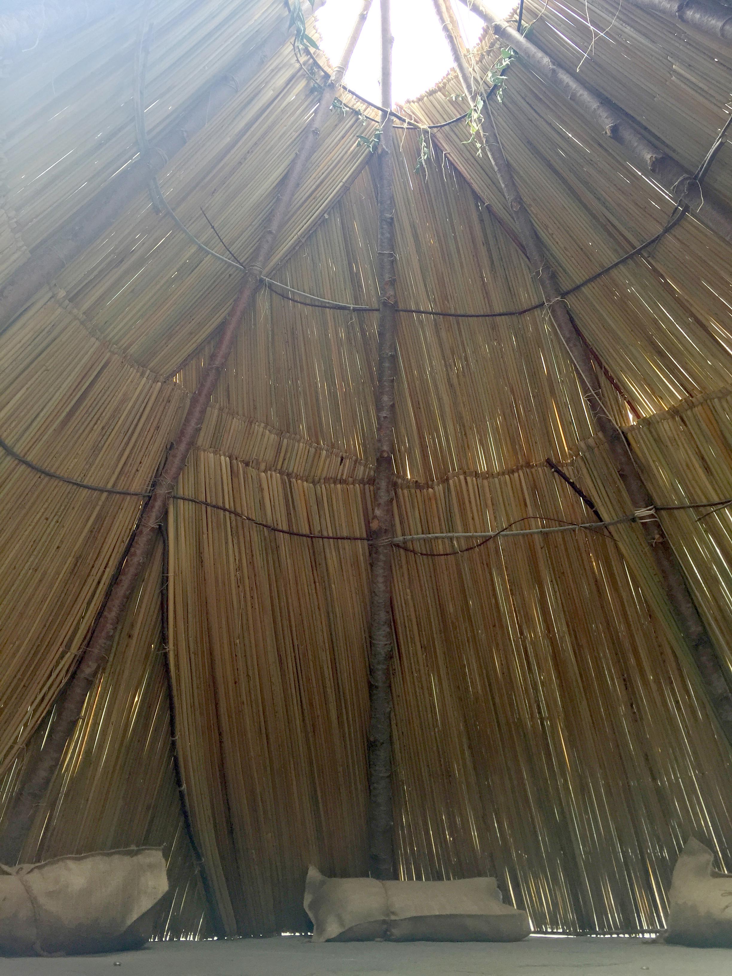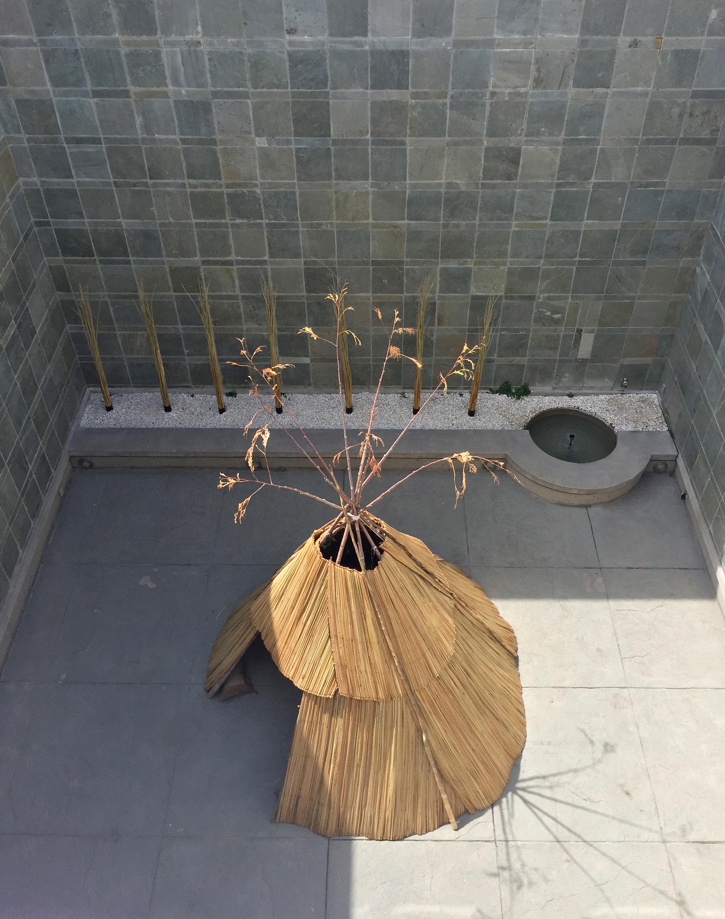 Visitors will encounter a variety of work in the two exhibition spaces that comprise the show. In Tāłtān Singing Machine, Tsēmā Igharas invites visitors into a karaoke booth where they can sing along in Tāłtān. Tiffany Shaw-Collinge’s works are based on the handicrafts of her great grandmother. The mylar sculpture that is suspended in the air and black plastic 3D printed works are based on the floral (wild Alberta rose) motif pattern that her great grandmother drew and used. Mariel Belanger’s outdoor courtyard installation entitled tukʷtniɬxʷ (Moon Lodge is a tule mat lodge, constructed using locally harvested reeds that were harvested, dried and woven together.