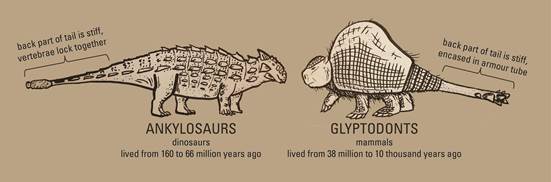 Ankylosaurs and glyptodonts both evolved similar armoured bodies with weaponized tails, but they weren't closely related to each other.