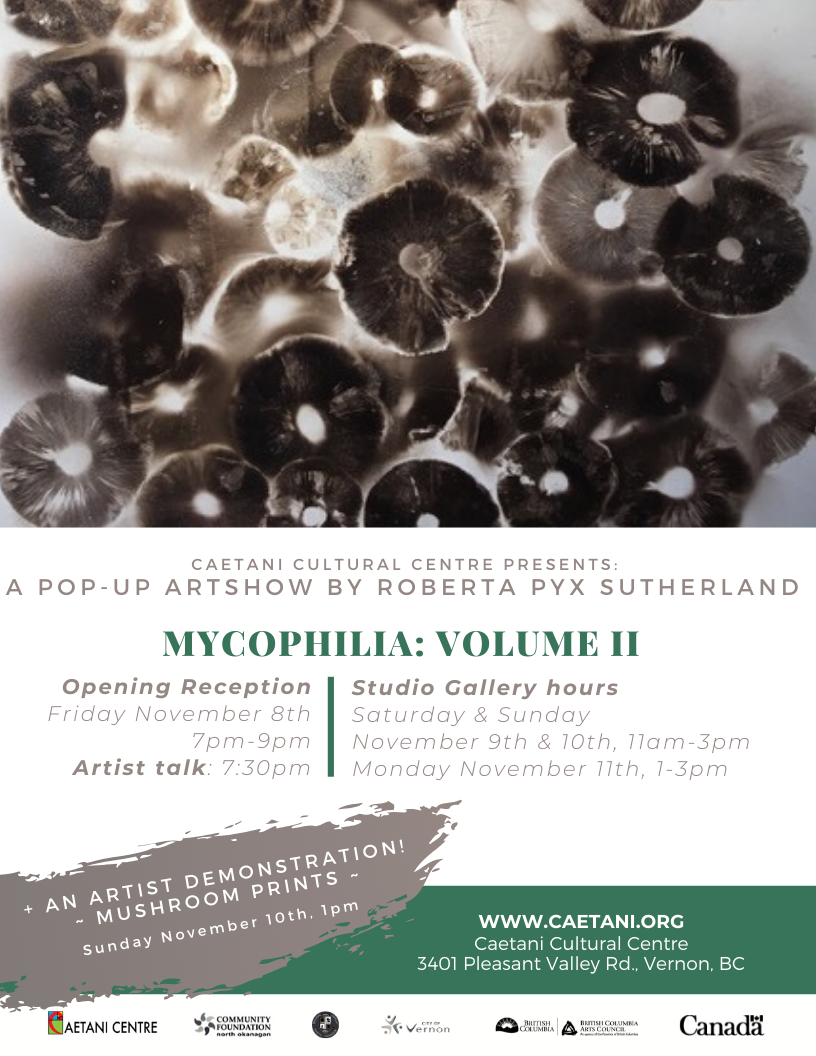 [BCMA] [media release - Caetani Cultural Centre] Mycophilia, Volume II: Mushroom Print Artshow with Roberta Pyx Sutherland, Nov 8, Caetani Centre, Vernon, BC