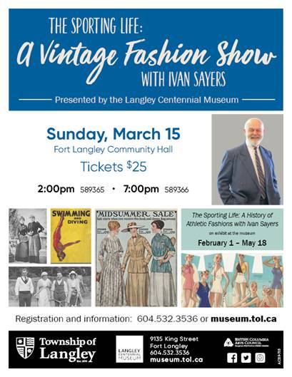 Tickets are still available for our upcoming fashion shows with Ivan Sayers on March 15 - get them while they last! There is now a reduced rate of $20 for the 7:00pm performance, and a lower rate could be arranged for students or groups. It's an interesting subject and one he hasn't presented previously. Contact museum at tol.ca<mailto:museum at tol.ca> for more details. "The Sporting Life" exhibit will be at the Langley Centennial Museum until May 18.