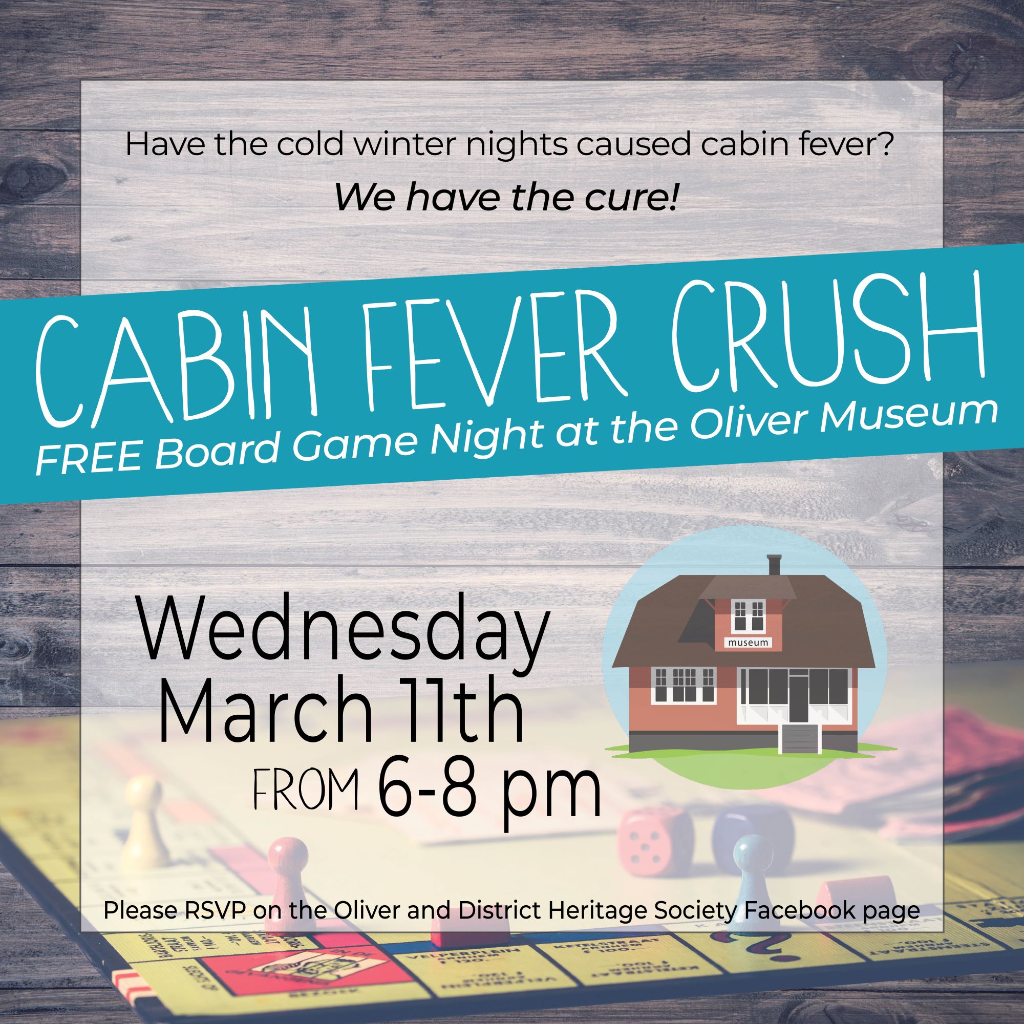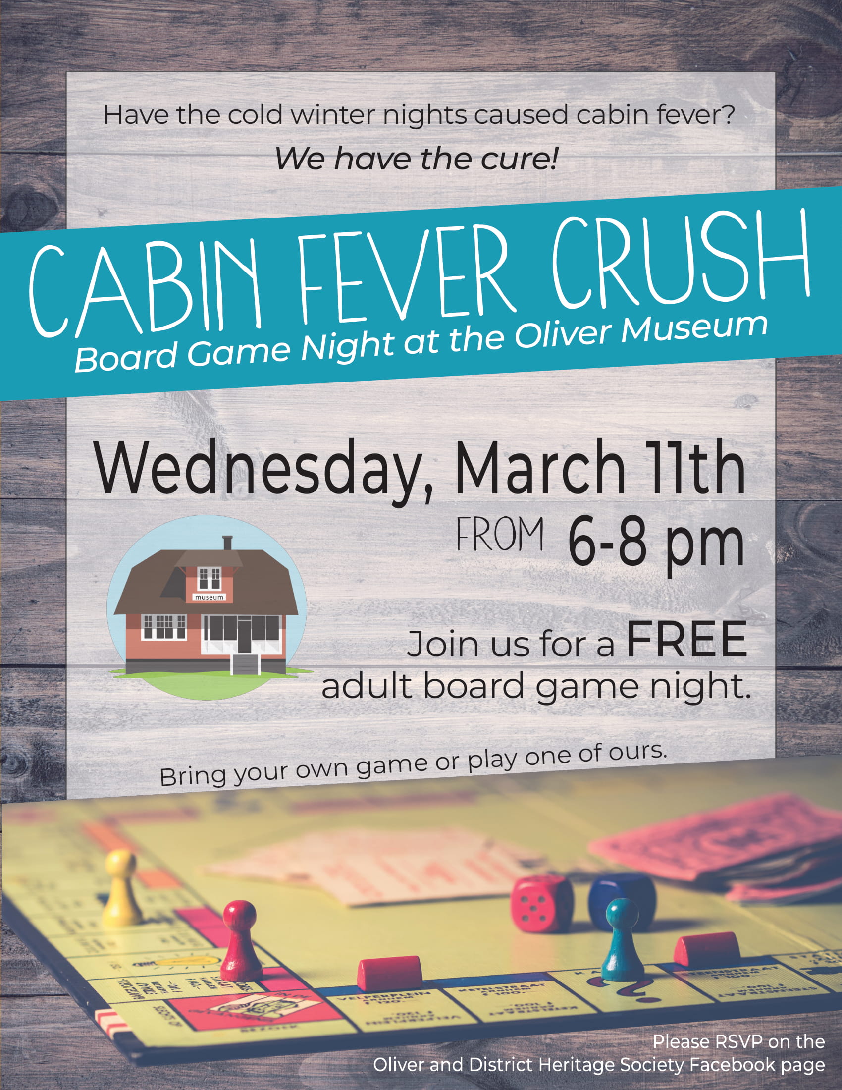 Oliver, BC - Cold weather and quiet evenings getting you down? Crush your cabin fever by joining us at the Oliver Museum for a board games night for grown-ups!