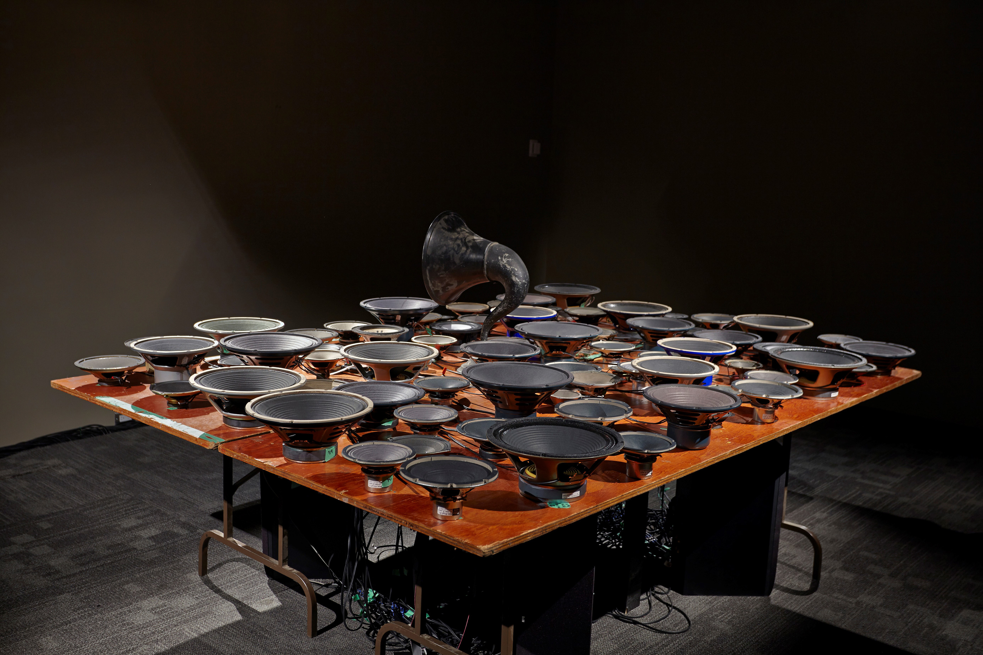 Experiment in F# Minor, by artists Janet Cardiff and George Bures Miller, is an array of bare speakers of all shapes and sizes set upright on a large wooden table. Like a conductor at the head of an orchestra, visitors will create a sculptured music symphony with their movements and position in the space. Light sensors are inlaid into the edge of the table and as viewers move around the room, their shadows will cause the various sound and instrumental tracks to fade up, overlap, mingle and fade down.