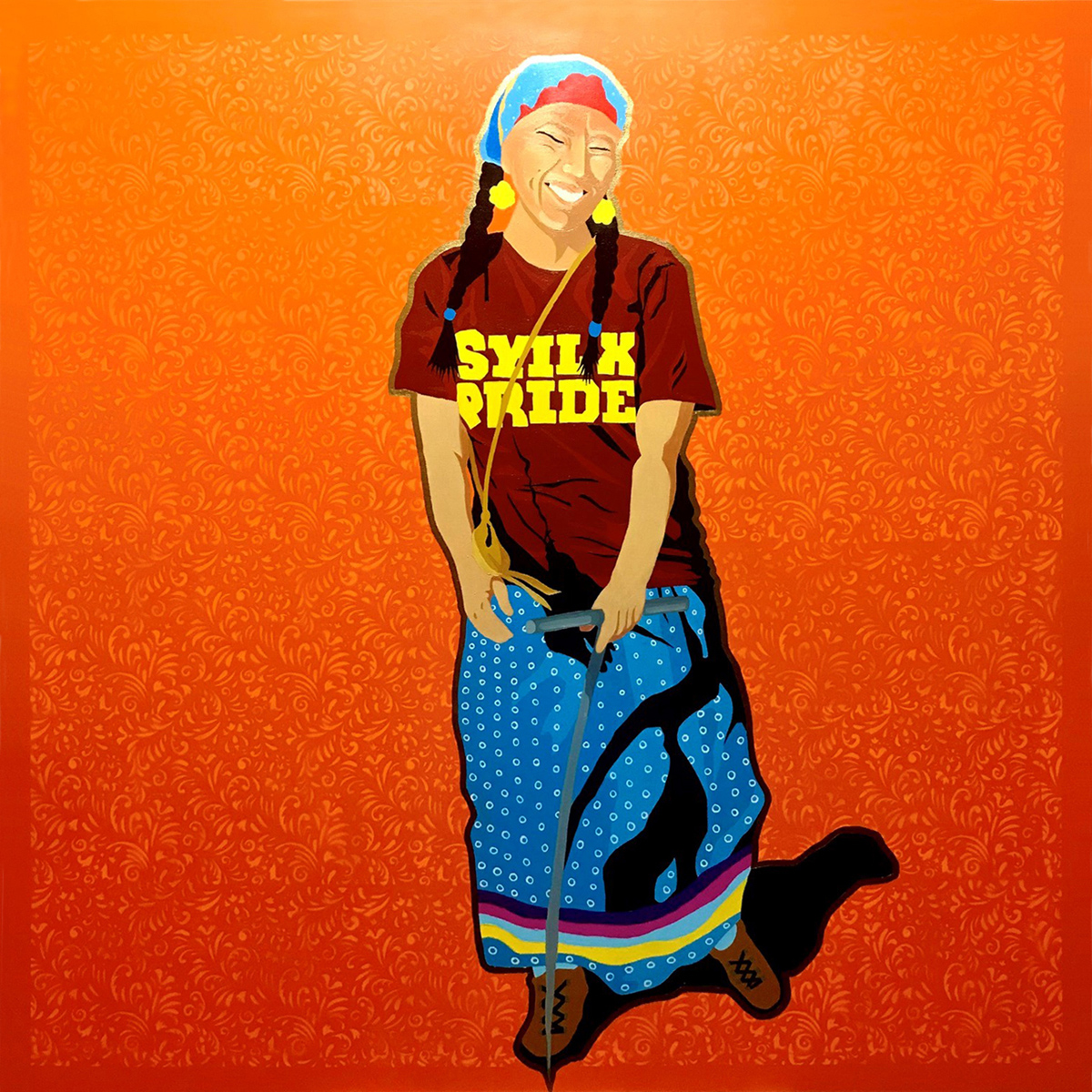 The exhibition is titled puti kʷala – we are still here and features six colourful multi-layered portraits that celebrate the beauty of the syilx/Okanagan Nation’s history and culture.