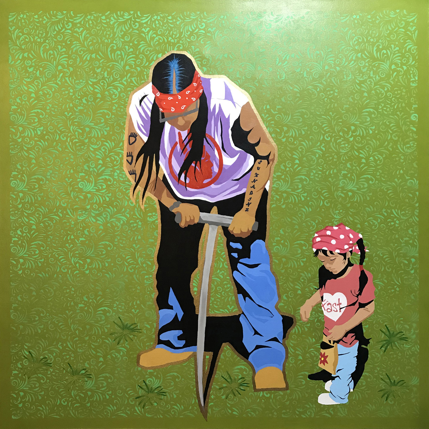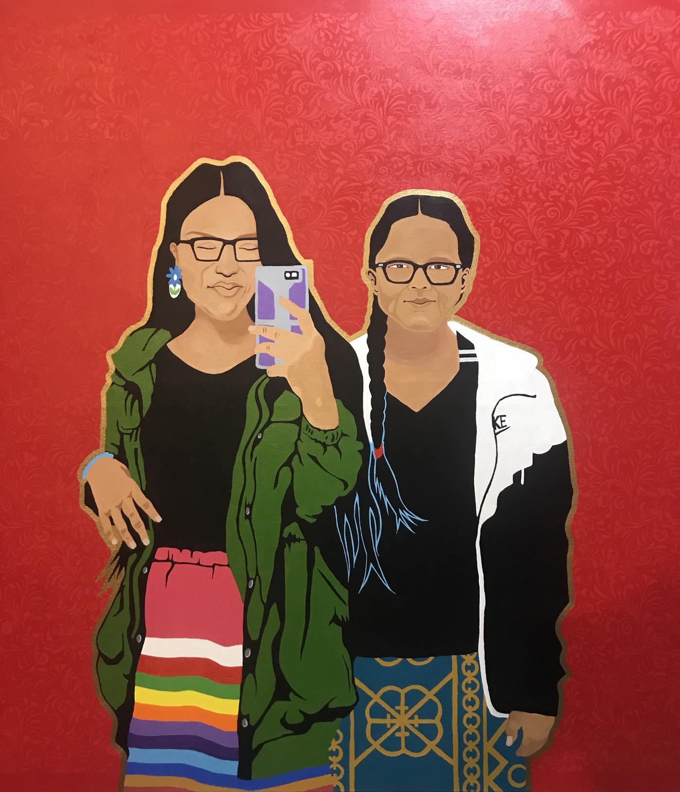 The paintings are rich with intricate filigree patterns and incorporate a mix of traditional and contemporary imagery. In them, we see generational snapshots — a grandfather teaching his young granddaughter how to plant seeds; two nieces snapping a selfie; and a boy proudly showing off the prize-sized fish he caught. The portraits reveal a glimpse into the artist’s own extended family life, but viewers will no doubt find pieces that resonate with their own.