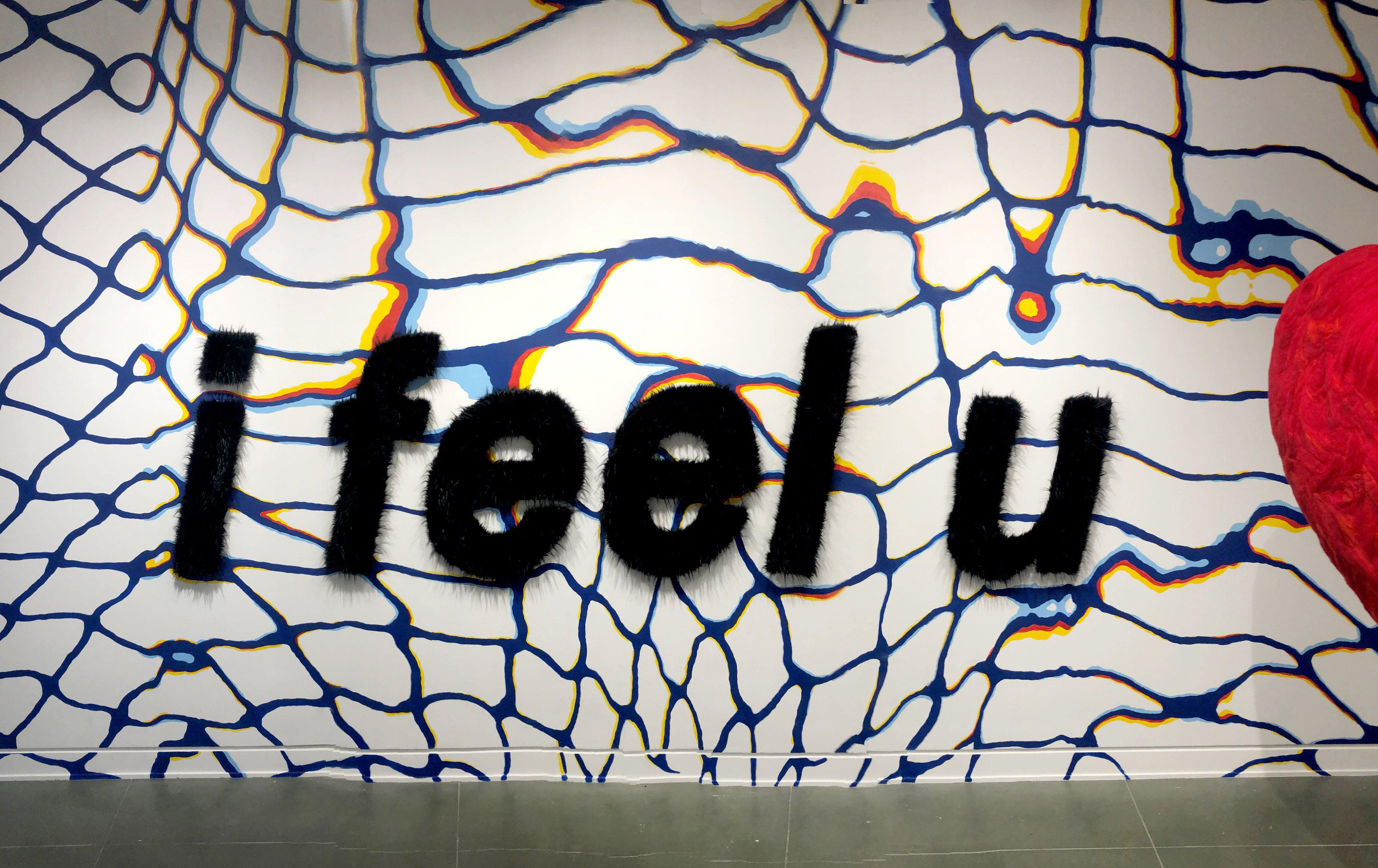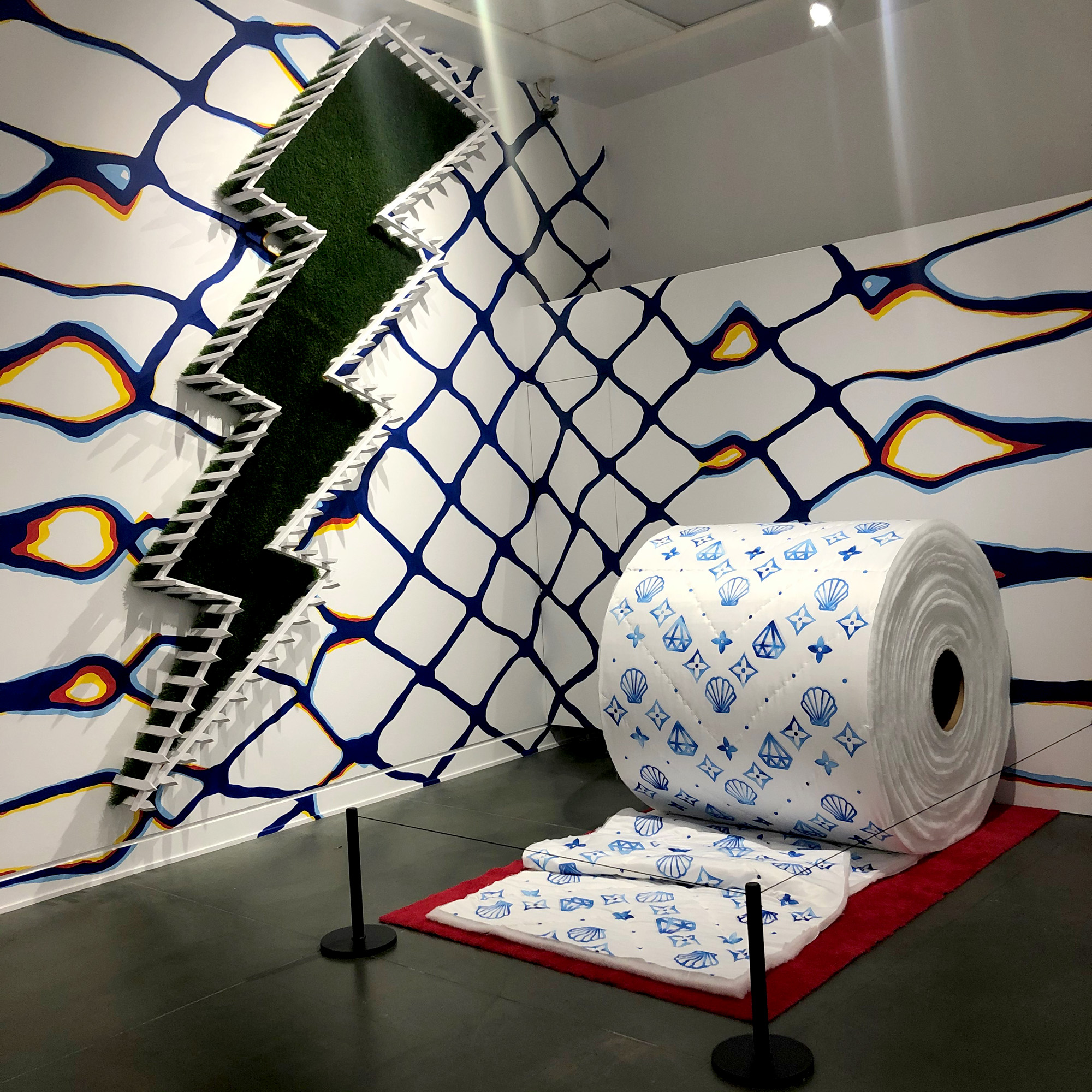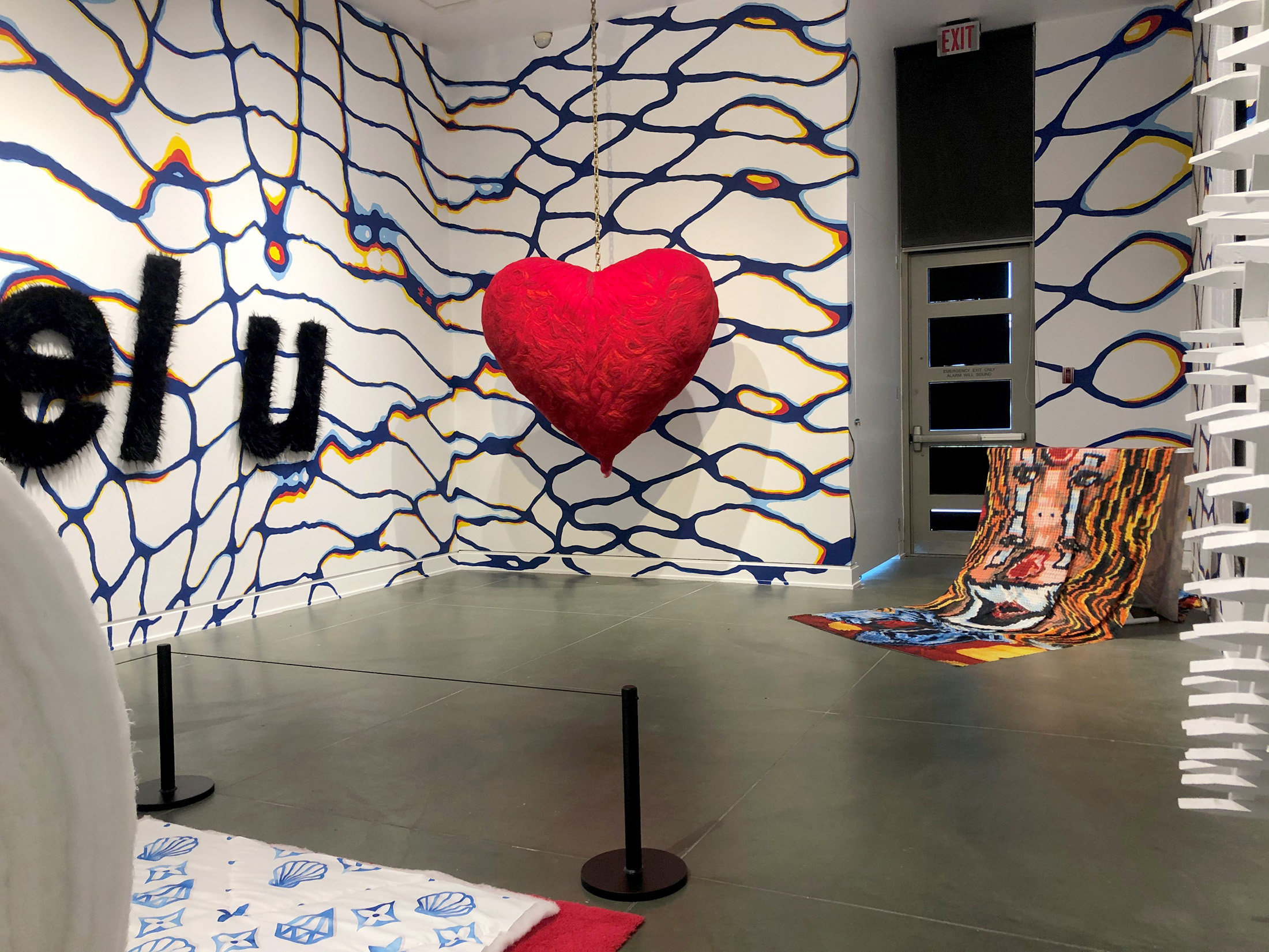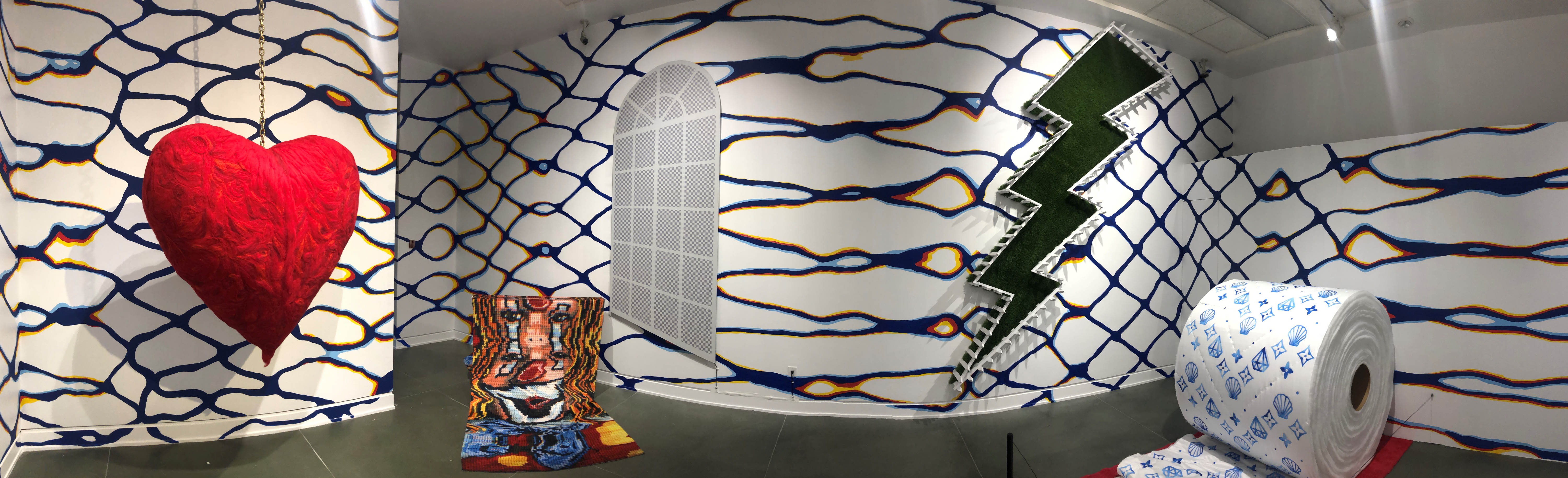 Wrapping the gallery’s walls is a hand-painted mural called Networth (2020) that features organic web-like blue lines that envelope the viewer in the room. Suspended within this are a number of objects that have been dramatically enlarged and re-imagined. Saturated (2020) is a giant person-sized toilet roll that is made of quilted fabric with hand-painted symbols on each sheet. Heartfelt (2019) is a six-foot tall blood-red felted heart that is suspended from the ceiling by a thick gold chain. Fool’s Gold (2020) is a titan twelve-foot tall lightning bolt that is hard to ignore, mounted high on a wall in punchy green AstroTurf.