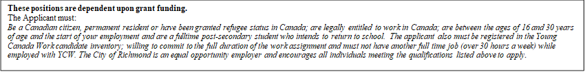[These positions are dependent upon grant funding. The Applicant must: Be a Canadian citizen, permanent resident or have been granted refugee status in Canada; are legally entitled to work in Canada; are between the ages of 16 and 30 years of age and the start of your employment and are a fulltime post-secondary student who intends to return to school. The applicant also must be registered in the Young Canada Work candidate inventory; willing to commit to the full duration of the work assignment and must not have another full time job (over 30 hours a week) while employed with YCW. The City of Richmond is an equal opportunity employer and encourages all individuals meeting the qualifications listed above to apply.]