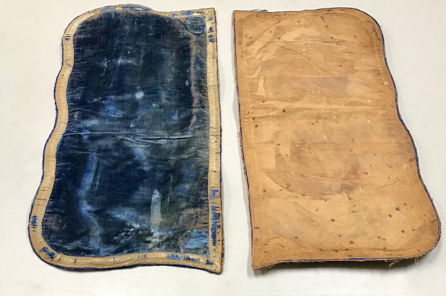 We’re hoping that someone can help us identify these items from our museum, (see attached photo). They came as part of a large collection but with no indication as to what they might be. They are old and very worn, with velvet on one side and leather on the other. Both have a small round impression in the same corner – this can be seen at the top centre of the photo. The velvet doesn’t appear to have been regularly sat or stepped on, so we don’t think they are seat covers or some kind of mat/rug. We’re stumped. Any ideas, museum pros?