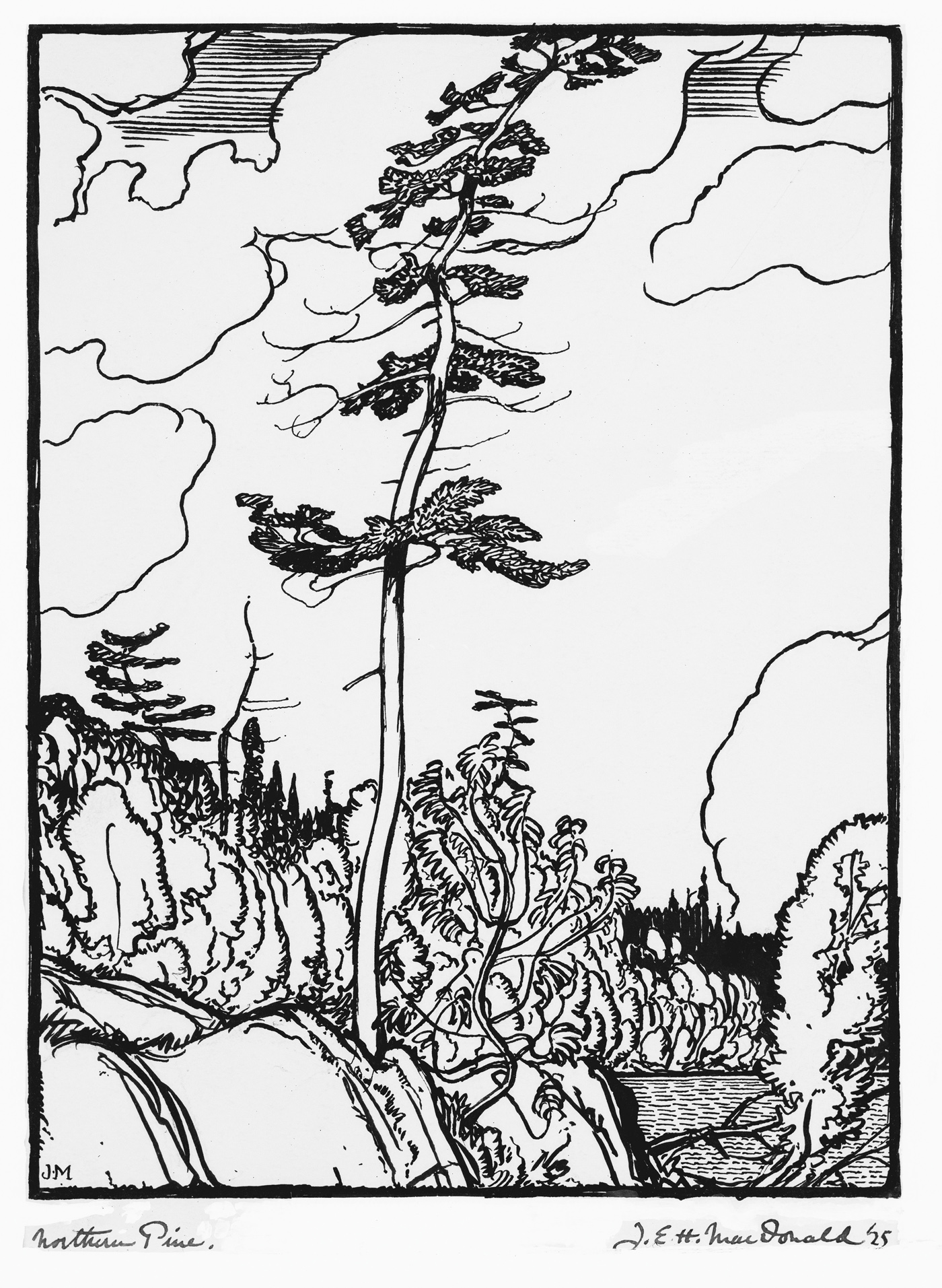 J.E.H. MacDonald, Northern Pine, 1925, ink over graphite with gouache on paper, 11 x 10.5 cm. Gift of the Founders, Robert and Signe McMichael. McMichael Canadian Art Collection.