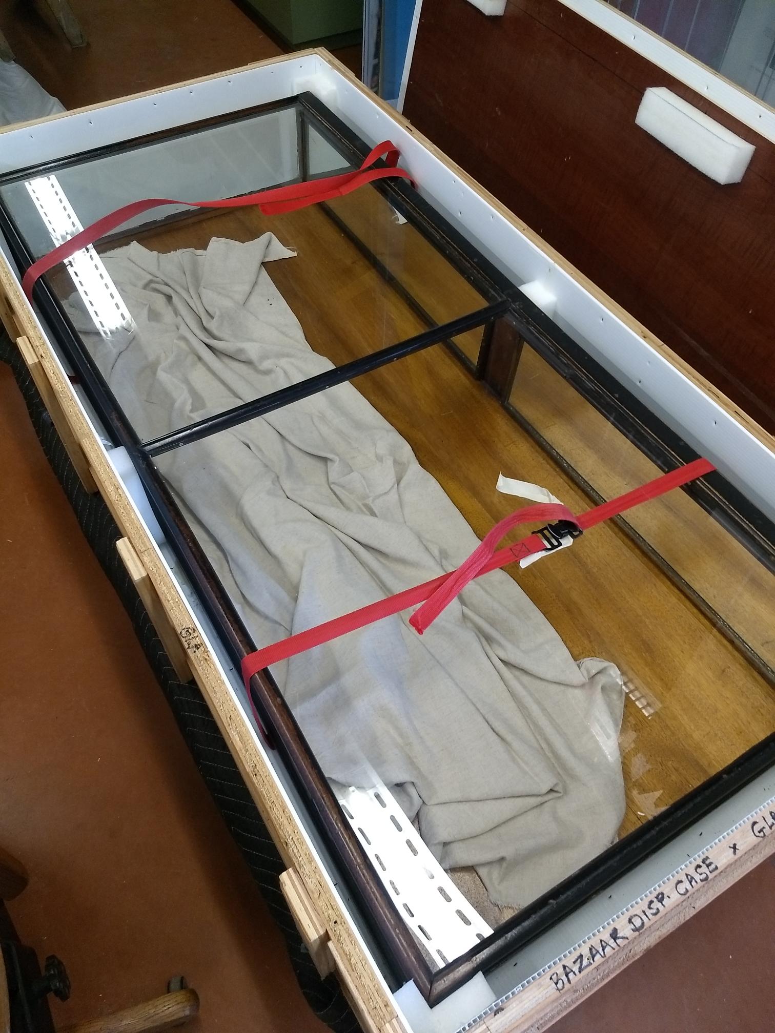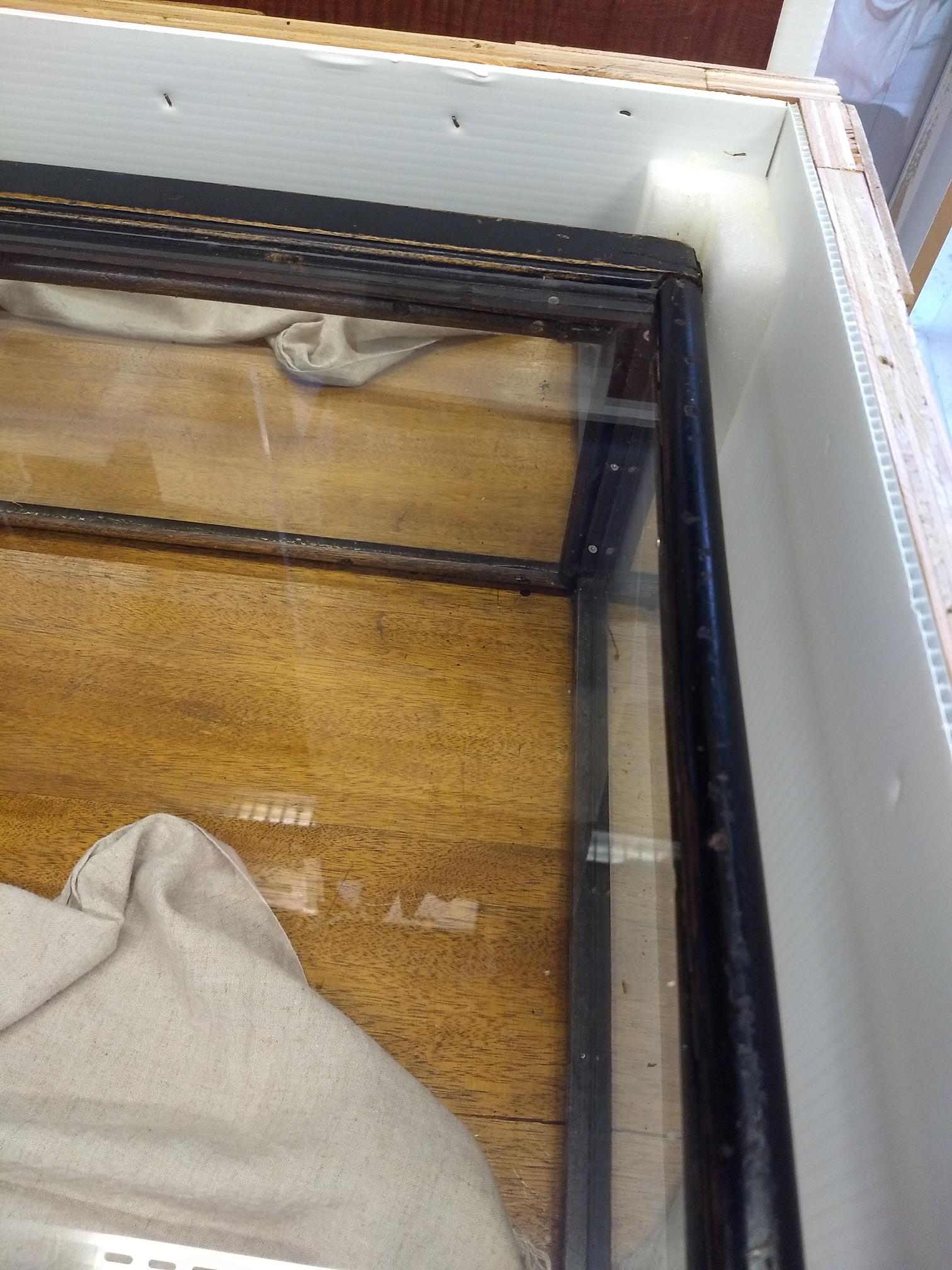 Glass display case, 60” wide X 27” deep X 9” tall, with wood base and frame. Mirrored back. Has crate.