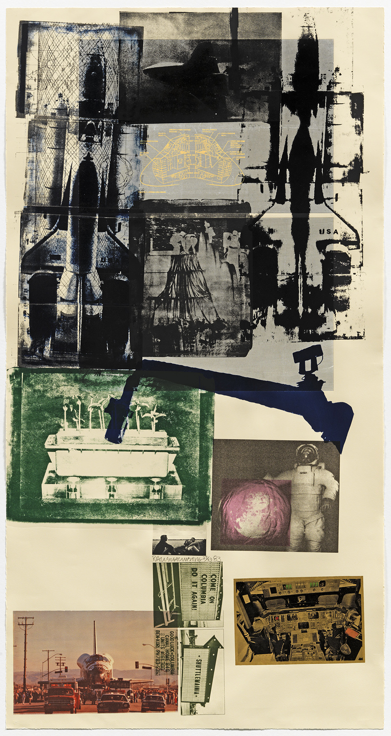 Robert Rauschenberg, Hot Shot, 1983, lithograph, collage, stencil, 206.3 x 108.0 cm, Collection of the Vancouver Art Gallery, Gift of J. Ron Longstaffe, © Robert Rauschenberg Foundation, Photo: Rachel Topham, Vancouver Art Gallery.